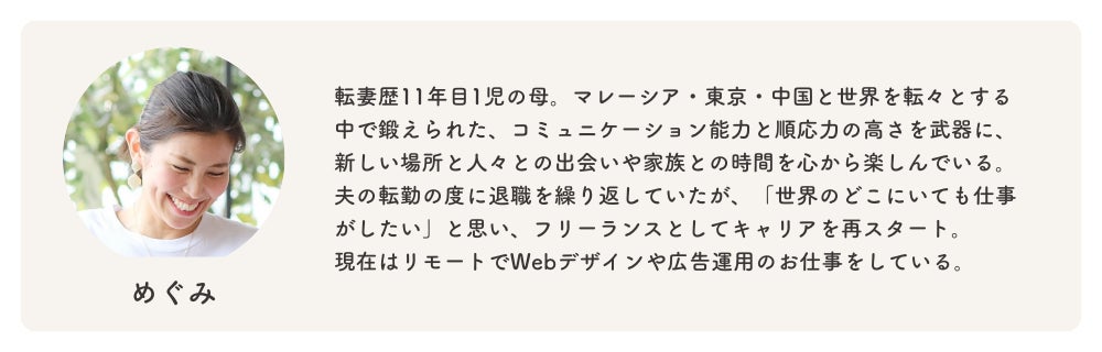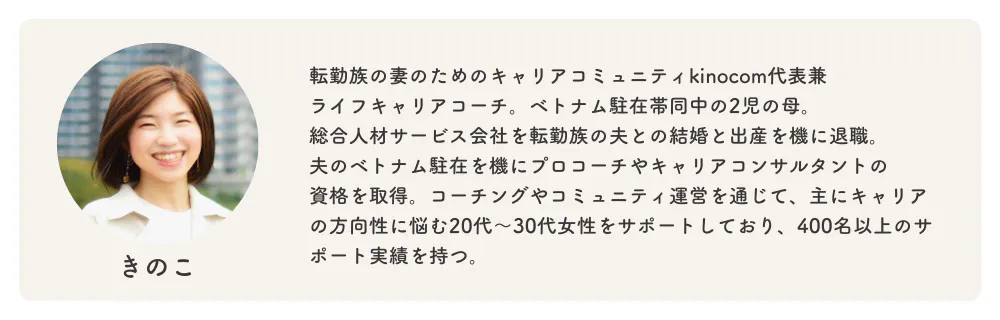 このことを私自身が強く感じたからこそ「転勤族でも"キャリア=人生"を諦めたくない」と願う転勤族の妻が、気軽につながれる居場所になるようなコミュニティを作りたいと思い、kinocomを立ち上げました。