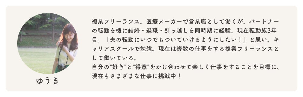 私は26歳で転勤族の妻になりました。私にとって20代とは、バリバリ働いて自信を持てるスキルを身につけ、やりたいことを見つける期間と捉えていました。