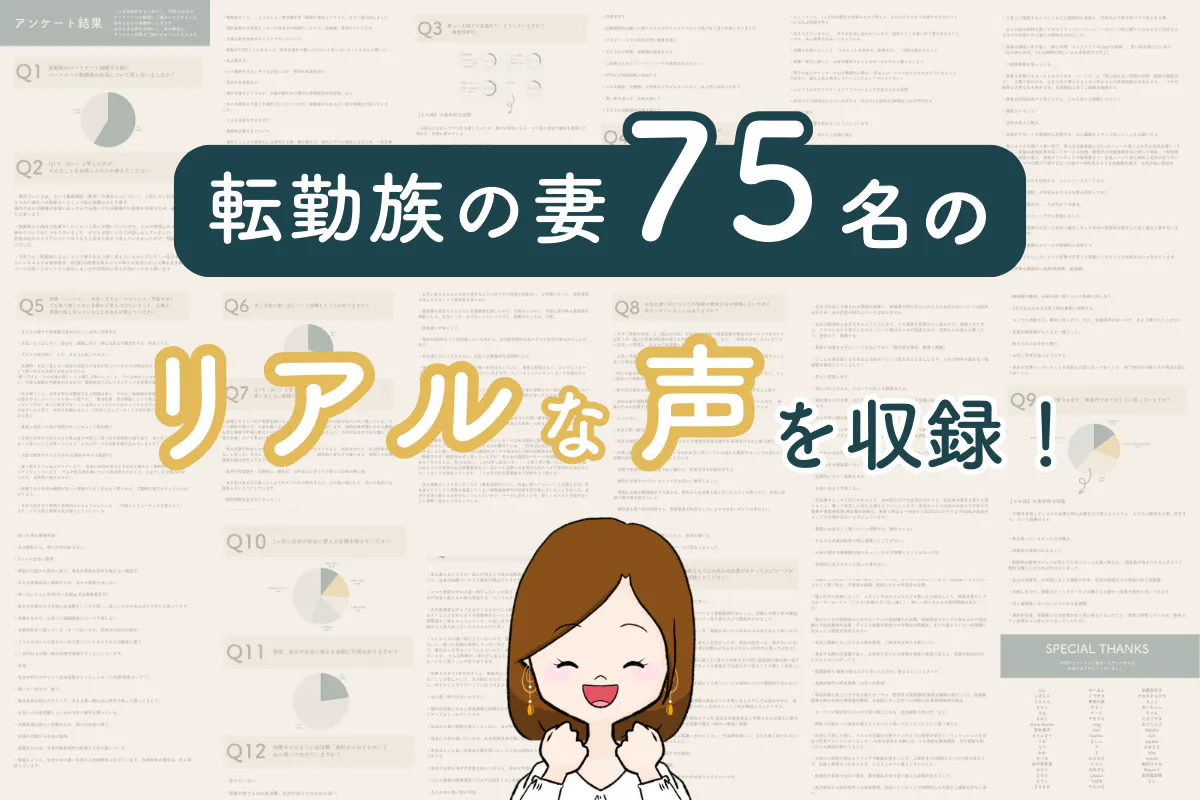 国内転勤〜海外駐在まで、年齢も境遇も異なる75名の転勤族の妻の方々のアンケートを元に、リアルな経験談を収録しました。文中はもちろん巻末付録としても、いただいた声をまとめました。