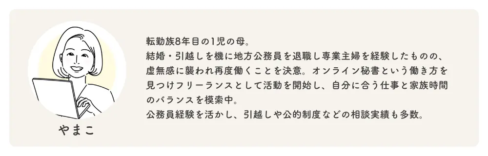 はじめまして。「転勤妻サポートBOOK」を出版する、転勤族の妻のためのキャリアコミュニティkinocom(キノコム)代表の山口由香子(きのこ)です。