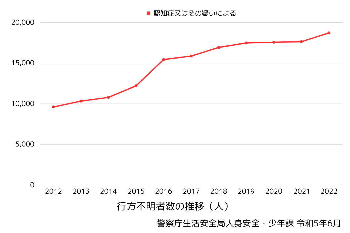 認知症による行方不明者は、この10年でほぼ倍増しています。2022年の警察庁の調査では、認知症が原因での捜索の届け出が18,000件を超えているそうです。この人数は警察に行方不明者届が出された人数なので、実際はもっと多くの人が行方不明になっているでしょう。