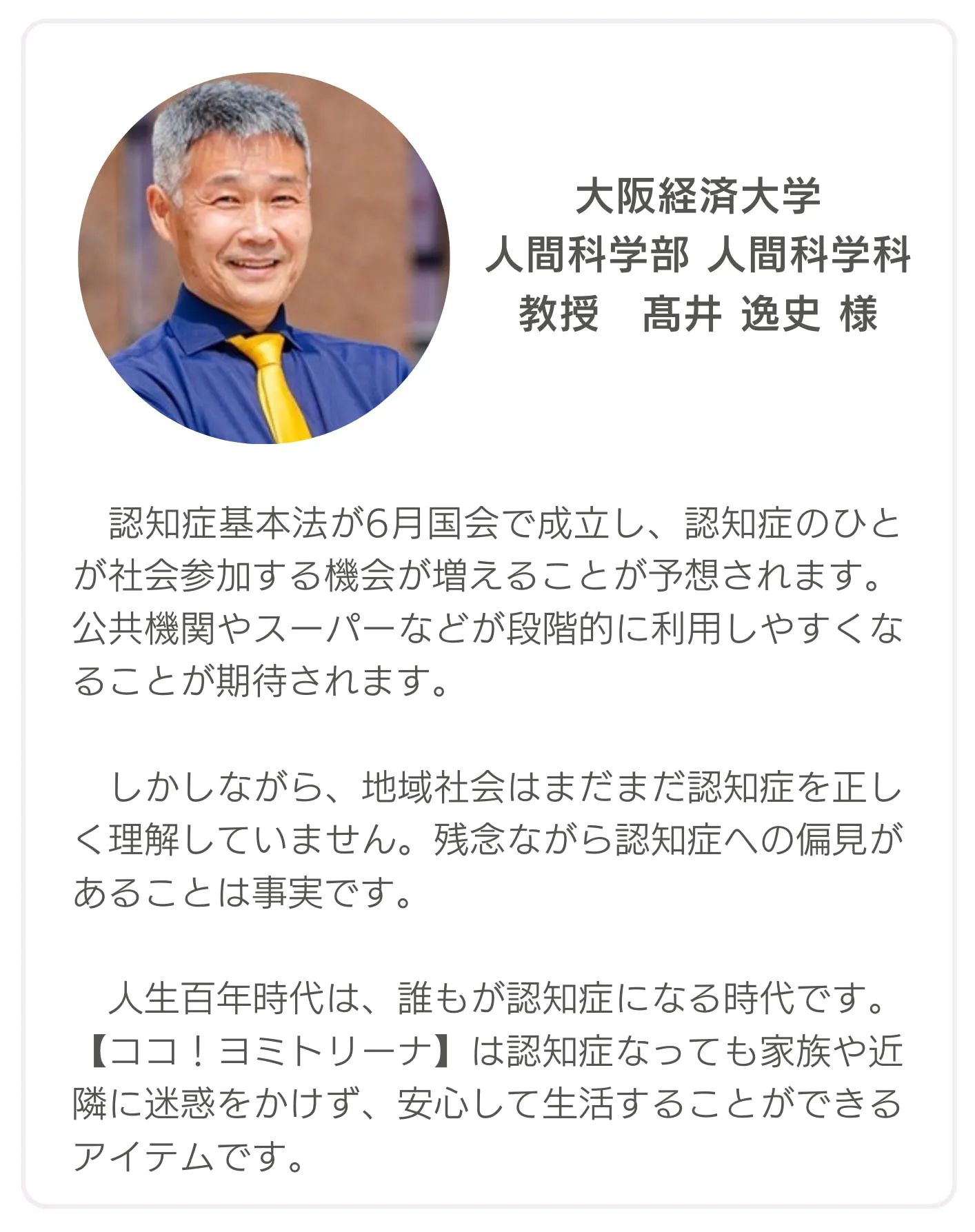 今まさに絶賛介護中のご家族の皆様をはじめ、僕の【ココ!ヨミトリーナ】への想いにご賛同いただける方、クレアフィールドの松井大祐さんと大阪経済大学の高井教授の心意気を感じてくださった方、【ココ!ヨミトリーナ】に興味を持ってくださった方、僕たちとつながる全ての皆様に【ココ!ヨミトリーナ】を応援していただけたら感無量です。