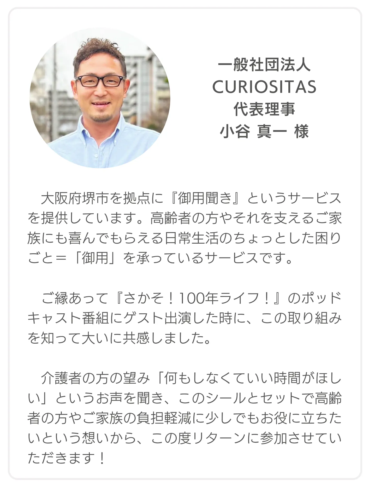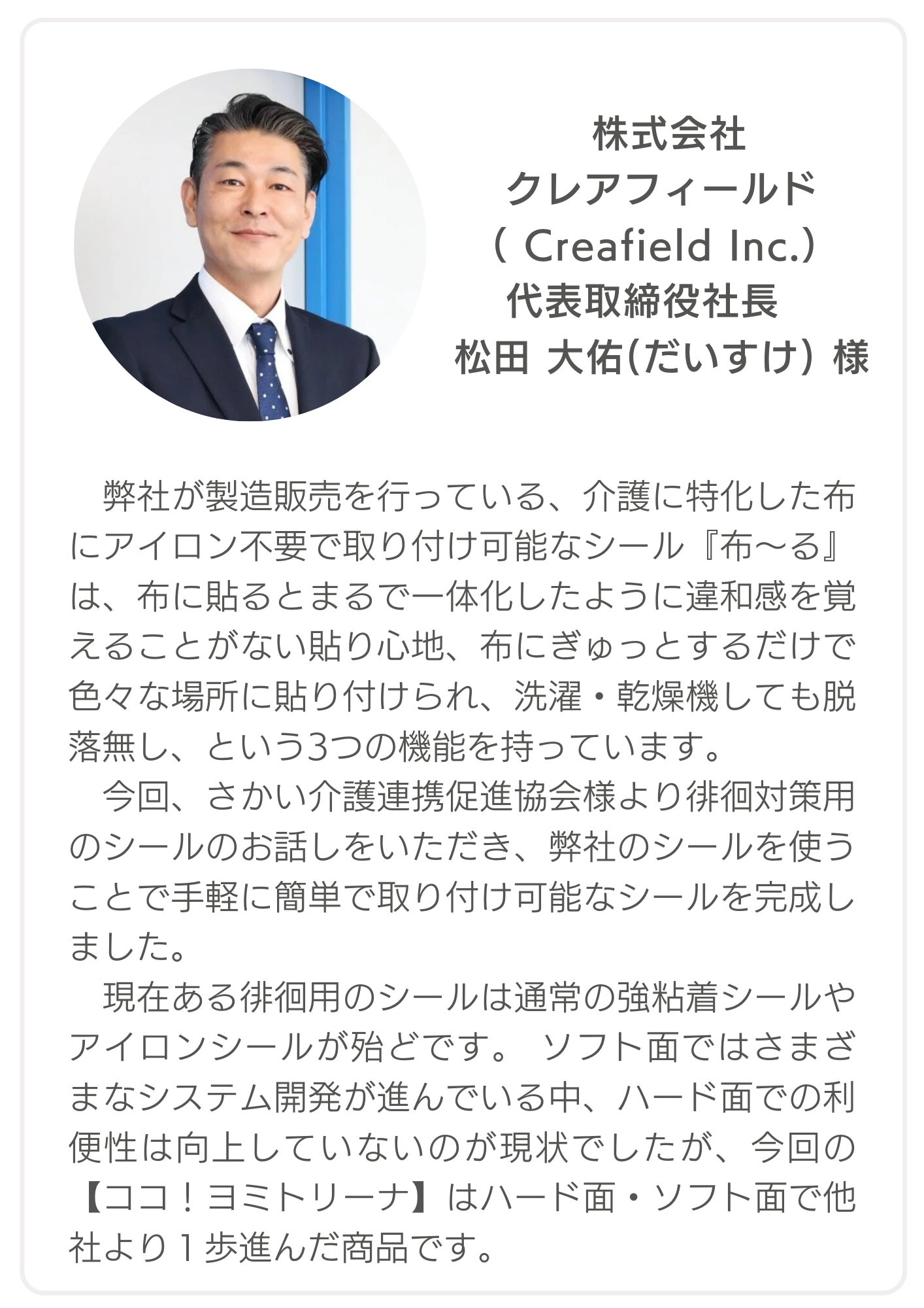 そんな時、2021年10月にクレアフィールドの松田大祐さんが「さかそ!100年ライフ!」のゲストに来てくださったんです。洗濯してもはがれない布用名前シール『布~る』を広めたい、ということだったんですが、その際の雑談で行方不明者の数が増えている話になり、