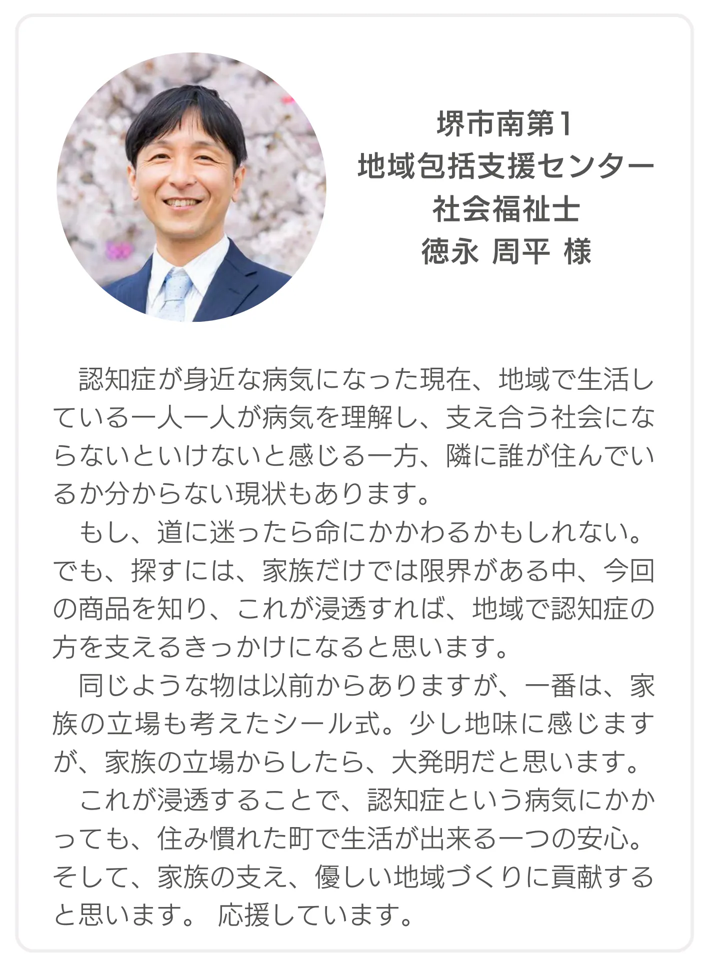 現在、行政で類似シールの配布を行っている地域もありますが、残念なことにアイロンプリントなのです。アイロンの手間をなくすだけでも楽になりますし、いなくなった時にすぐ探せるシステムが構築されれば、現場は本当に楽になるはずです。
