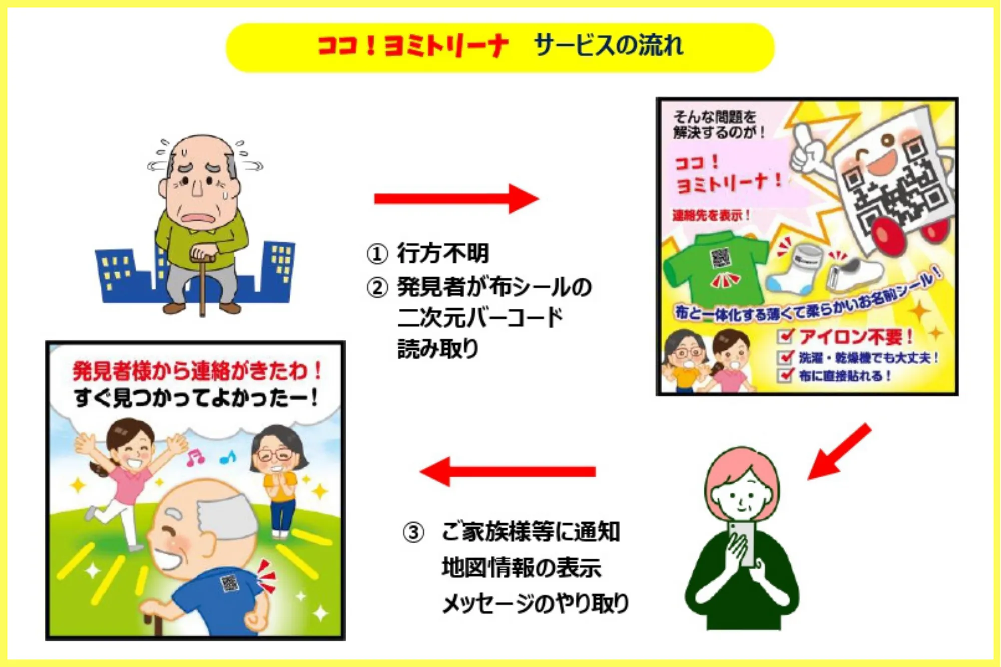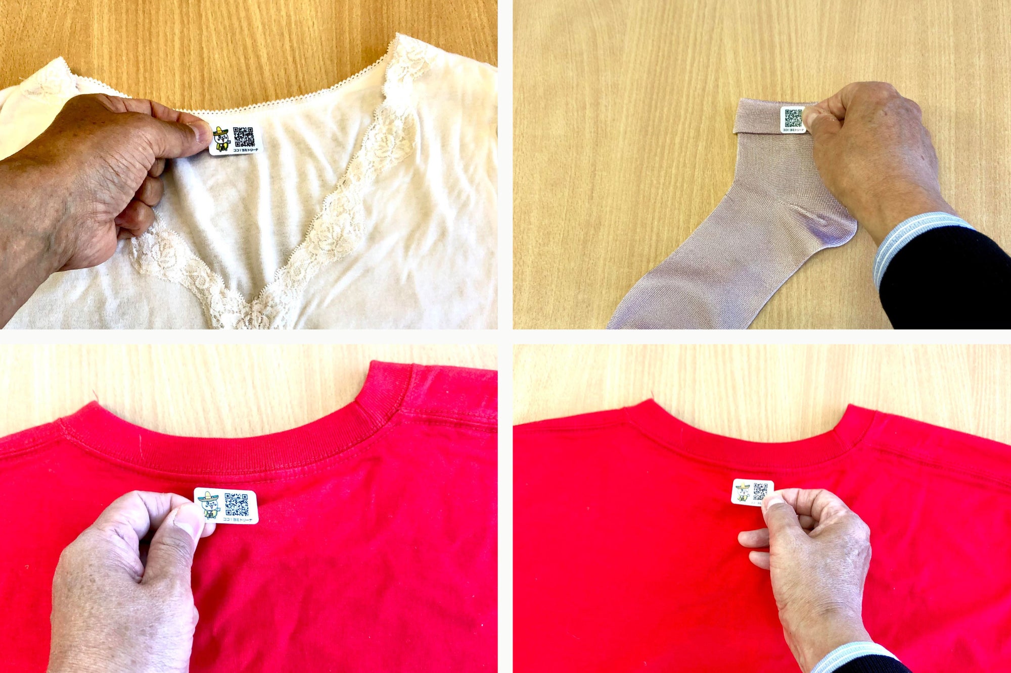 【ココ!ヨミトリーナ】は、二次元バーコードが印刷された、布と一体化する薄くて柔らかい、徘徊防止シールです。