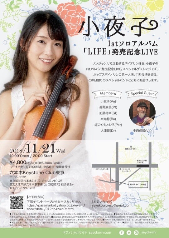 2018/09/23 22:09またまたお久しぶりの活動報告になってしまいました... さて、アルバムの製作も佳境に差し掛かっておりますが、 発売記念ライブの詳細が決定いたしましたのでお知らせします。 * * * * * * * * * * * * * * * * * * * * * * * * * * * * * * * 小夜子1stソロアルバム発売記念LIVE ポップスからクラシックまで、 ノンジャンルで活動する バイオリン弾き、小夜子の1stアルバム発売記念LIVE。 スペシャルゲストにジャズ、ポップスバイオリンの第一人者、 中西俊博を迎えこの日限りのスペシャルなバンドとともに お届けします。 11/21(水) 19:00 Open/20:00 Start 六本木Keystone Club東京 〒106-0032 東京都港区六本木7-4-12 ジャスミンビル2F 都営大江戸線六本木駅下車 【出口8(B2F)】 徒歩約2分 TEL 03-6721-1723 ¥4,800(税込)(当日¥5,300)+2 order(シートチャージ¥500別途) 小夜子(Vn) 眞間麻美(Pf) 加藤裕幸(Gt) 米光椋(Ba) 塩のやもとひろ(Per) 大津惇(Dr) Special Guest中西俊博(Vn) ■上演中の撮影は、静止画に限り可能です。 ただし他のお客様のご迷惑になると判断した際はお断りすることが ございます。 ■会場内で係員の指示及び注意に従わない場合、 入場をお断りしたり、 ご退場頂く場合があります。■各公演は、映像収録および写真撮影用のカメラが会場内に入り、 ご来場のお客様の様子が映像に映りこむ場合がございます。 収録された映像・写真は商品化やプロモーション等に使用される 可能性がございますので、予めご了承下さい。■チケットご購入後のキャンセル・払い戻しは一切できません。 ■未就学児童の入場は可能です。 ただし他のお客様にご迷惑をおかけ すると判断した場合はご退席をお願いする可能性がございます。 ■都合により、 興行内容の一部を変更する場合がありますのでご了承 下さい。 * * * * * * * * * * * * * * * * * * * * * * * * * * * * * * * 受付開始は10/1を予定しております。 お申し込み方法等については追ってお知らせいたします。 どうぞお楽しみに♫ もっと見る7月・8月活動報告!
