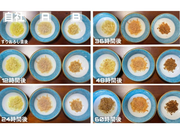 自社品質比較試験で、すりおろした後の変色の経過、風味の劣化など、酸化する早さが遅い「日持ちする生姜」だと認識しました。
