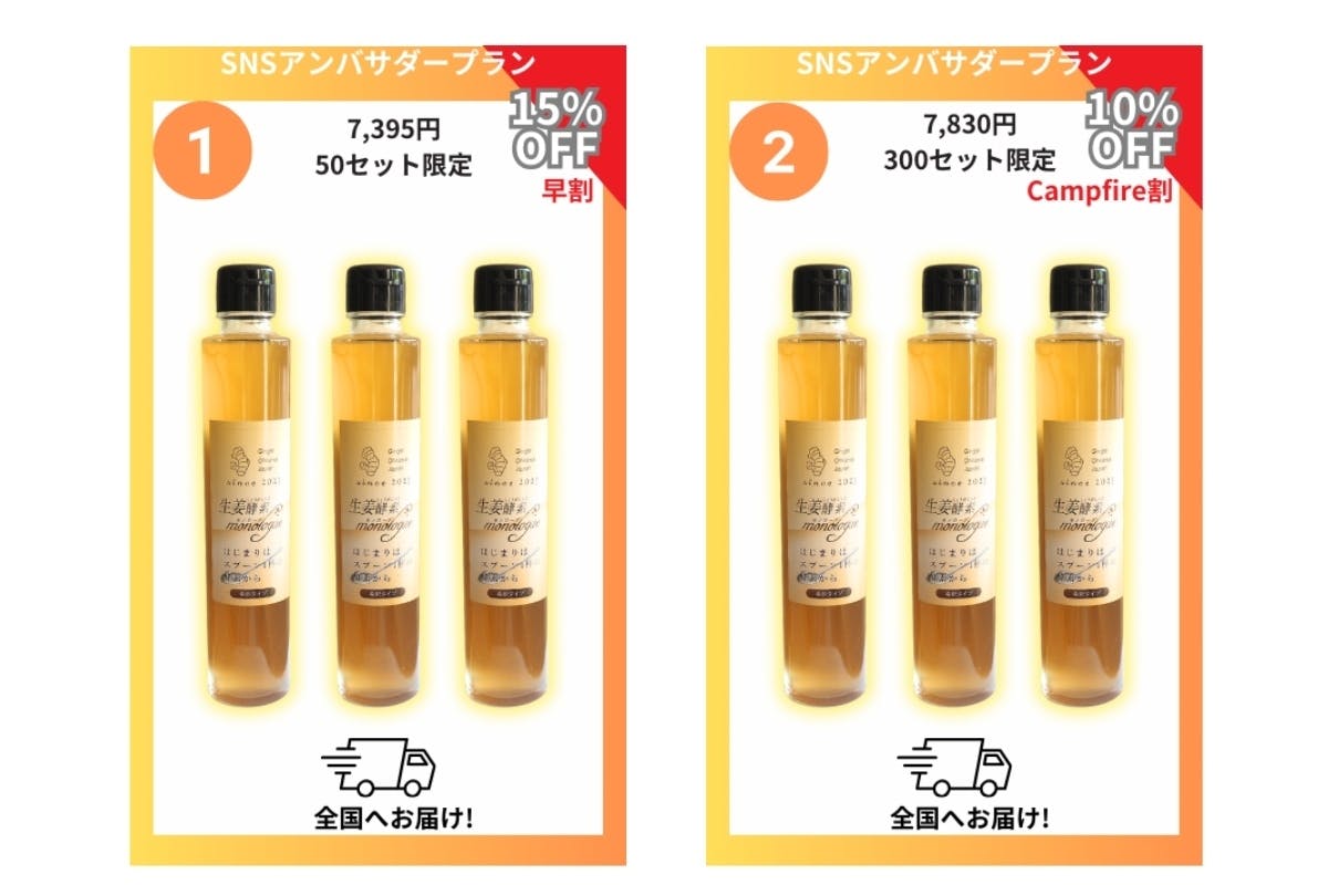 2024/02/02 15:30大変お世話になっております。このたびは生姜酵素プロジェクトご支援誠に有難うございました。本日リターンを出荷致しましたこと報告いたします。皆様のご健康の一助となりますこと祈念いたします。今後とも何卒宜しくお願い致します。 もっと見る本日最終日です!