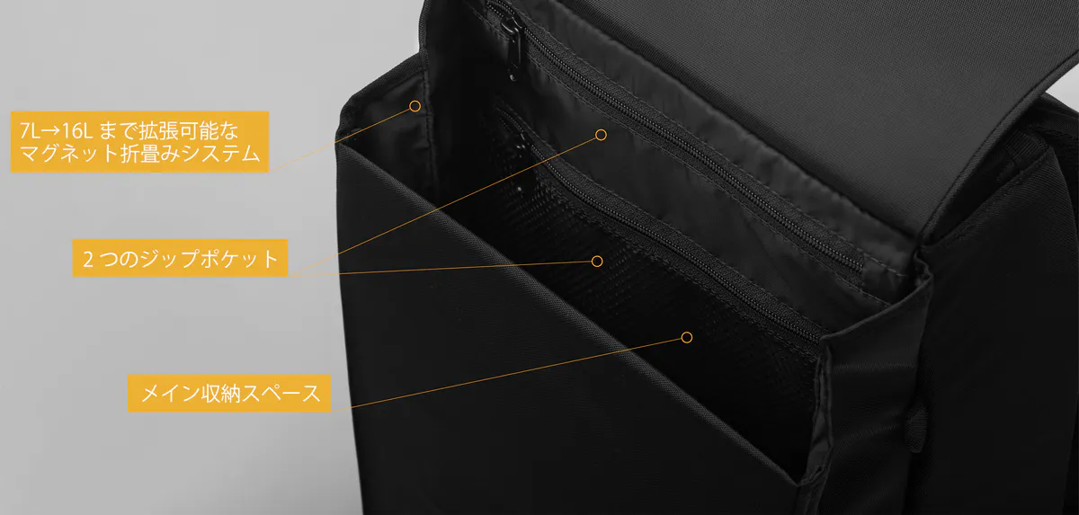 通常の拡張型バックパックと異なり、マグネット式で段階的に必要な分だけ拡張していくため、無駄にだぶついた印象を与えることもありません。