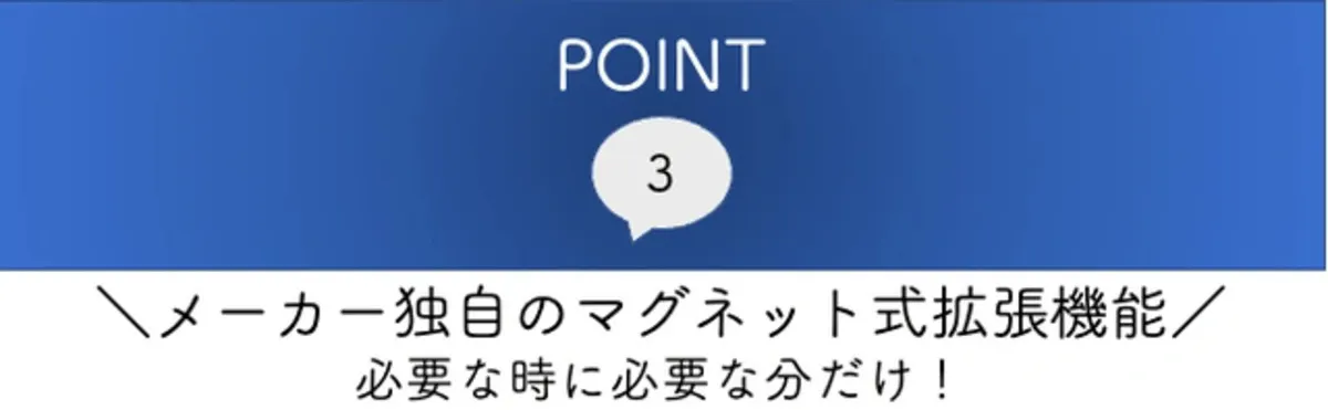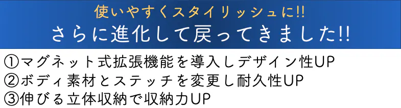 メーカー独自のマグネットを用いた、開閉システムや段階式拡張システムなど、ユニークで痒い所に手の届く使い心地が叶います。