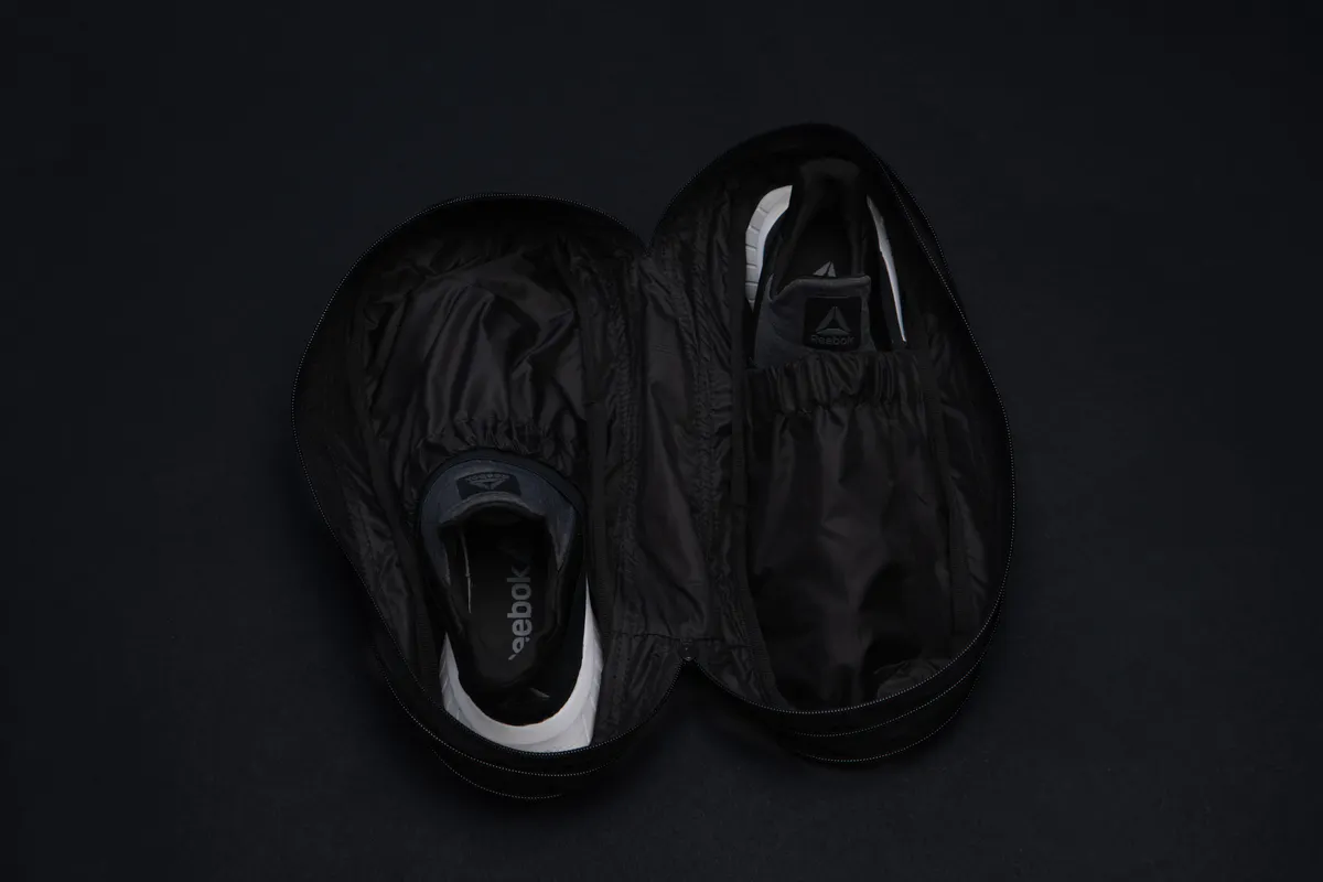 衣類やシューズを収納可能な専用収納ポーチ。