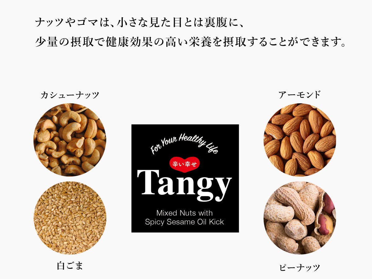 辛くて美味しい魔法の万能調味料 「Tangy」には、豊富な栄養素を含むナッツやゴマがザクザクと入っています。