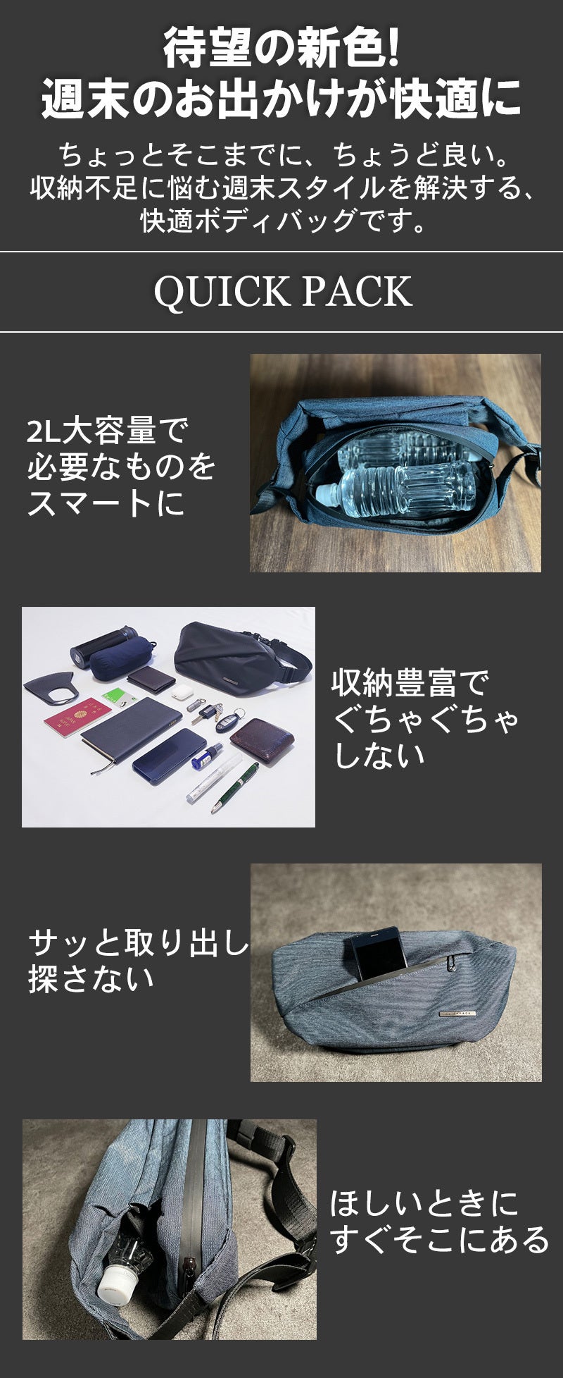 ご愛用者様からこんな声をいただいているQUICK PACKは、シンプルでコンパクトな見た目以上に、たっぷり収納するのが特徴です。