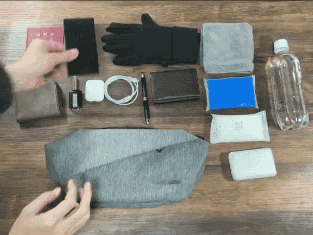 38×6×16cmで、ペットボトルからスマホ、パスポートまで入ります。