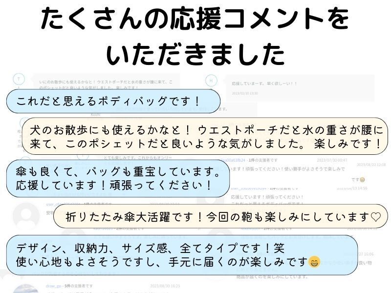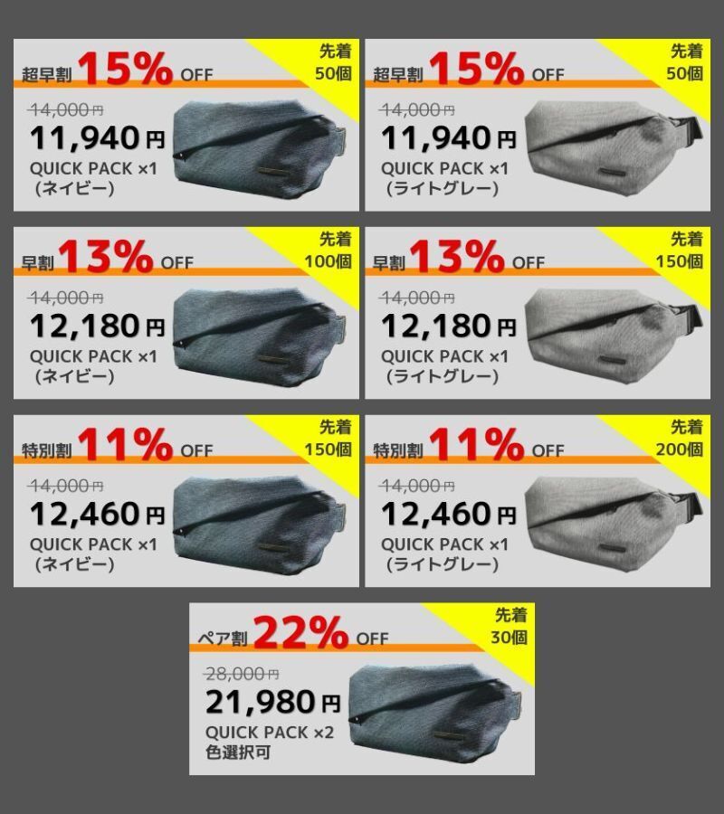 2026/03/27 12:30支援者のみなさまいつもプロジェクトの応援ありがとうございます。本日12時よりあなたのワークライフを快適にするボディバッグ「2サイズ同時の限定販売」が公開されました。【タブレット対応】QUICK PACK 11sは「大容量なコンパクトモデル」。普段タブレットや電子書籍とマイボトル程度で通勤される方に最適のサイズ。男性女性問わず“体にフィット”するサイズ感で、1,000名近い方にご愛用頂いています。一方、【A4/PC対応】QUICK PACK 15sはリュックは大きい、ショルダーでは小さい...そんなニーズに応える15インチサイズのワーカーズバッグ。ノートPCとA4の書類、充電器にマウスなど、ガジェットをまるっと持ち歩くことが多い方にピッタリ。どちらも斜め掛けでサッと掛けられ、荷物も入れやすい横長の形状。歩きや自転車での通勤にはもちろん、車や電車で荷物のつけ外しが多い方にも便利なバッグ。カジュアルすぎない、でもライトに使える。新しいバッグとフレッシュな気持ちで新年度を迎えてみませんか!?ぜひチェックしてみてください!>>【タブレット対応】QUICK PACK 11s>>【A4/PC対応】QUICK PACK 15s もっと見る