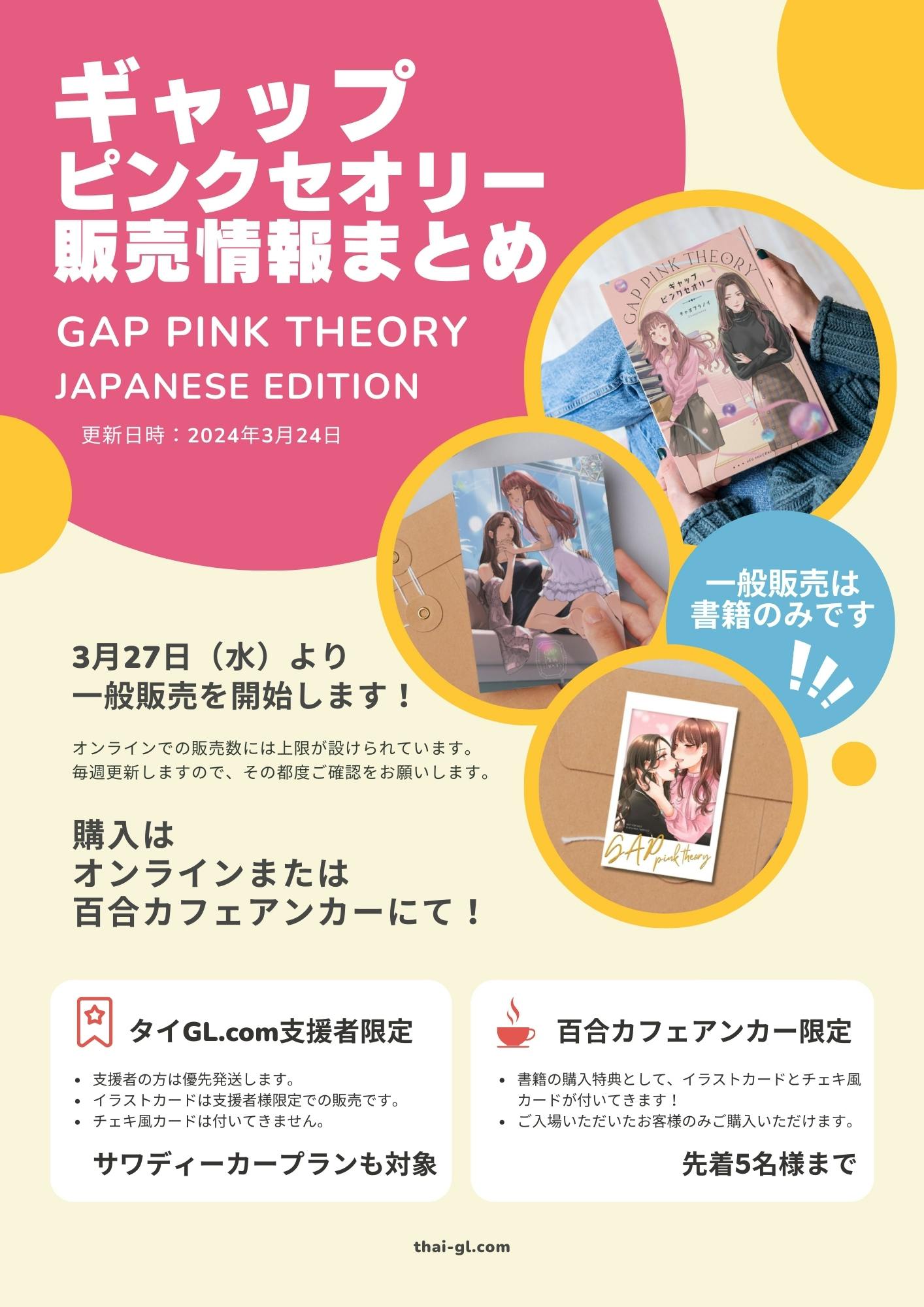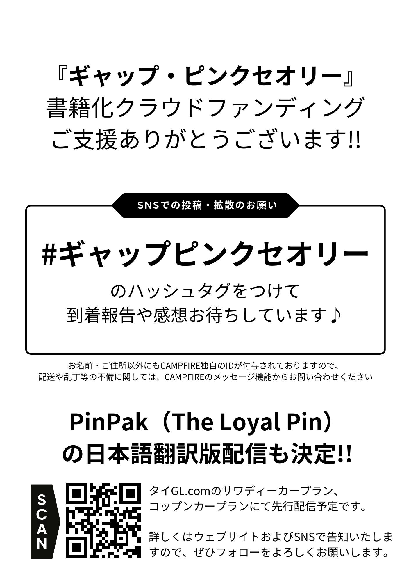 2024/03/14 19:19『ギャップ・ピンクセオリー』書籍化クラウドファンディングのリターンをすべて発送いたしました!!ご支援くださった皆様、有難うございます!! 本日、無事にすべてのリターンを発送・対応しましたのでご報告です。※複数ご支援された場合、別々に配送される可能性がございます。万が一、来週になっても届かない場合は、CAMPFIREのメッセージ機能からご連絡ください。可愛い(&分厚い)一冊に仕上がっておりますので、ぜひ読むだけでなく、お部屋にも飾ってくださいね♪なお、3月中に、タイGL.comのウェブサイトでも販売を開始します!!もう一冊欲しい!!という方は、ぜひそちらからご購入ください!! もっと見る【支援者限定】リターンの発送を開始しました!!【皆様ご確認ください】