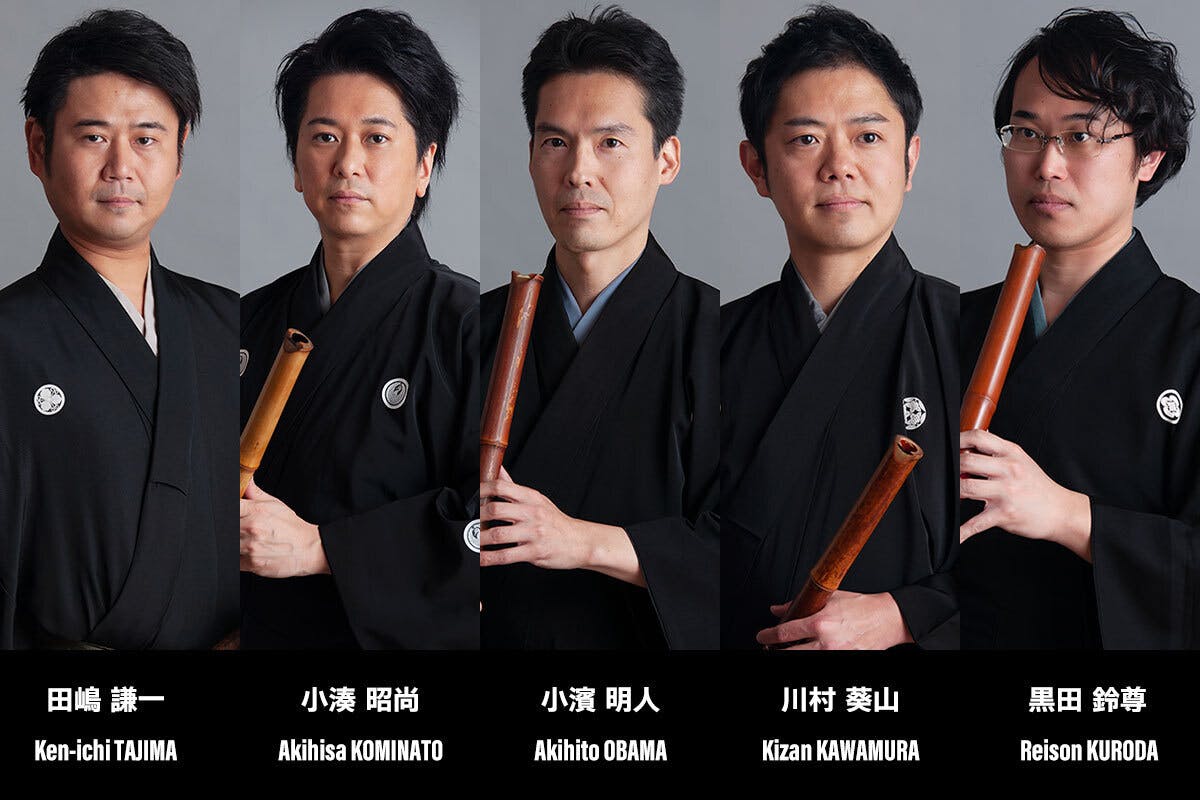 私達は、古典のみならず、現代の表現を求め活動を続ける5人、小濱明人・川村葵山・黒田鈴尊・小湊昭尚・田嶋謙一が結成した超流派の尺八グループです。2020年6月に作曲家 藤倉大氏が手掛けたテレワーク作品「Longing from afar」を本人の指揮と共に収録し動画を公開、これが実質的なデビューとなりました。また、同年12月には純邦楽専門誌「邦楽ジャーナル」の表紙を飾り、巻頭インタビューも掲載。年末に行った結成コンサートでは、藤倉氏に委嘱した「Shakuhachi Five」を世界初演、21年 発売のアルバム「Glorious Clouds/藤倉大」(Sony Music) にも収録されました。2022年に第2回定期公演を開催し、西村朗氏に委嘱した「五本の尺八のための《沙羅双樹》」を世界初演。2023年に第3回定期公演を開催し、望月京氏に委嘱した「観音アナトミー」を世界初演し、今日にいたります。