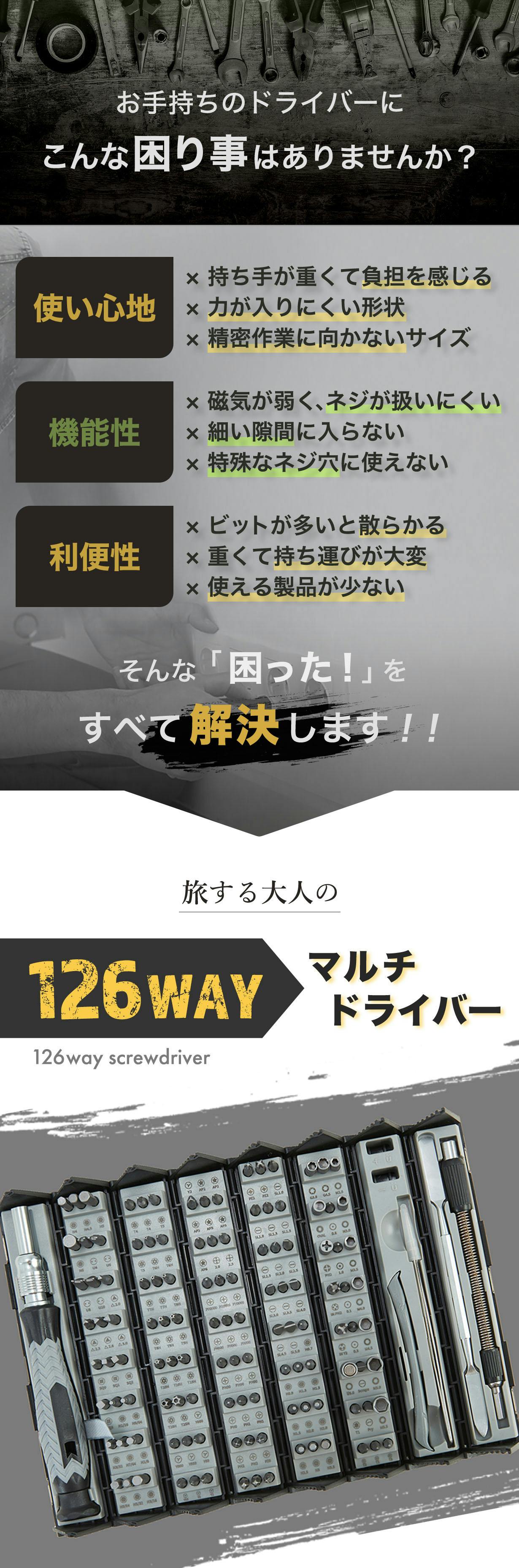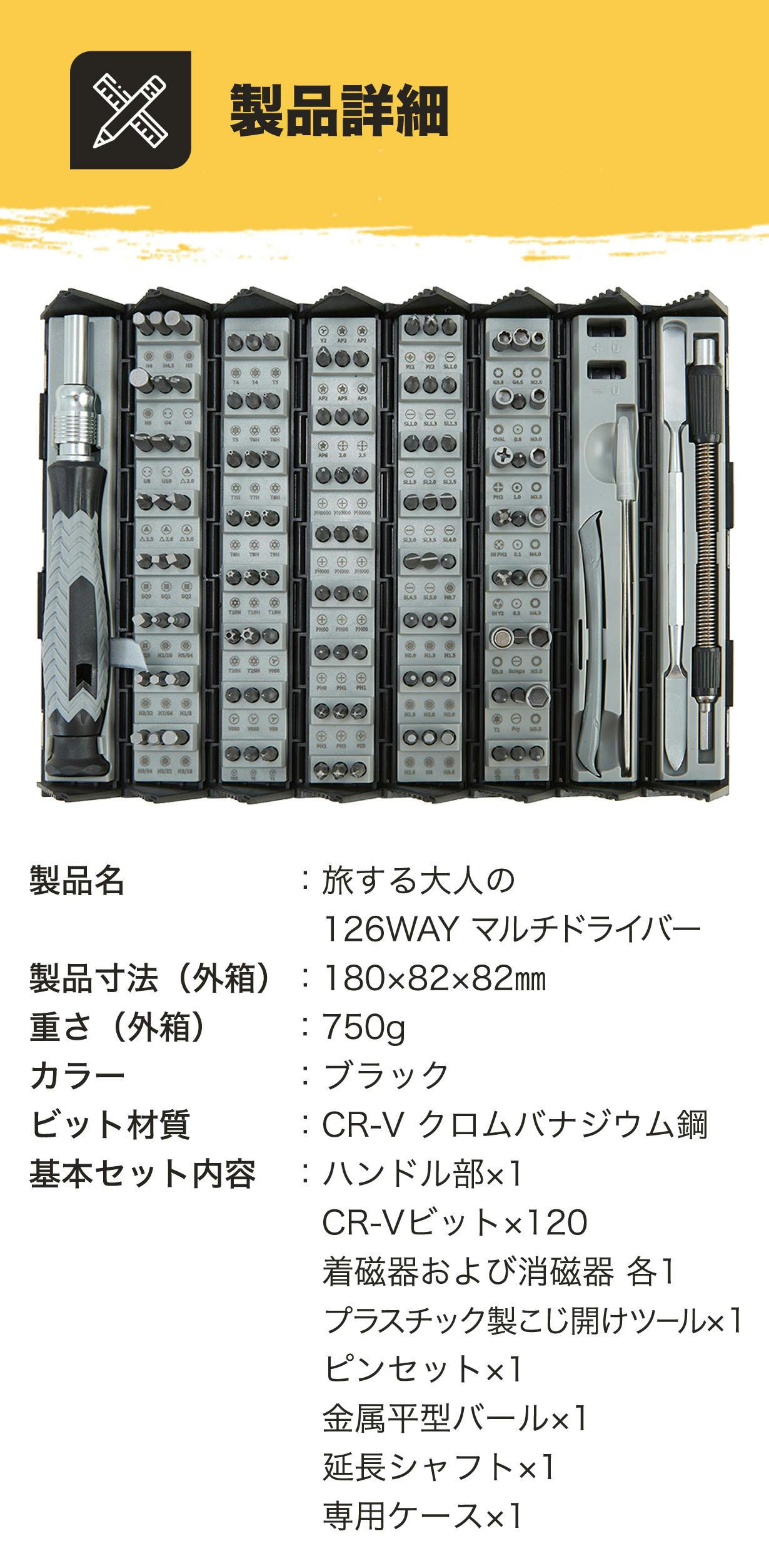【免責事項】本製品使用によるトラブルについては一切の責任を負いかねますので、ご了承ください。開発中の製品につきましては、デザイン・仕様が一部変更になる可能性もございます。 クラウドファンディングの性質上、以上の注意点につきまして予めご理解とご了承をいただいた上でご支援くださいますよう、何卒よろしくお願い申し上げます。 最後に、本製品を受け取られた皆様に喜んでもらえるよう、「旅する大人の126WAYマルチドライバー」チームメンバー一同、心を込めて対応して参りますので、 応援の程、よろしくお願い致します。