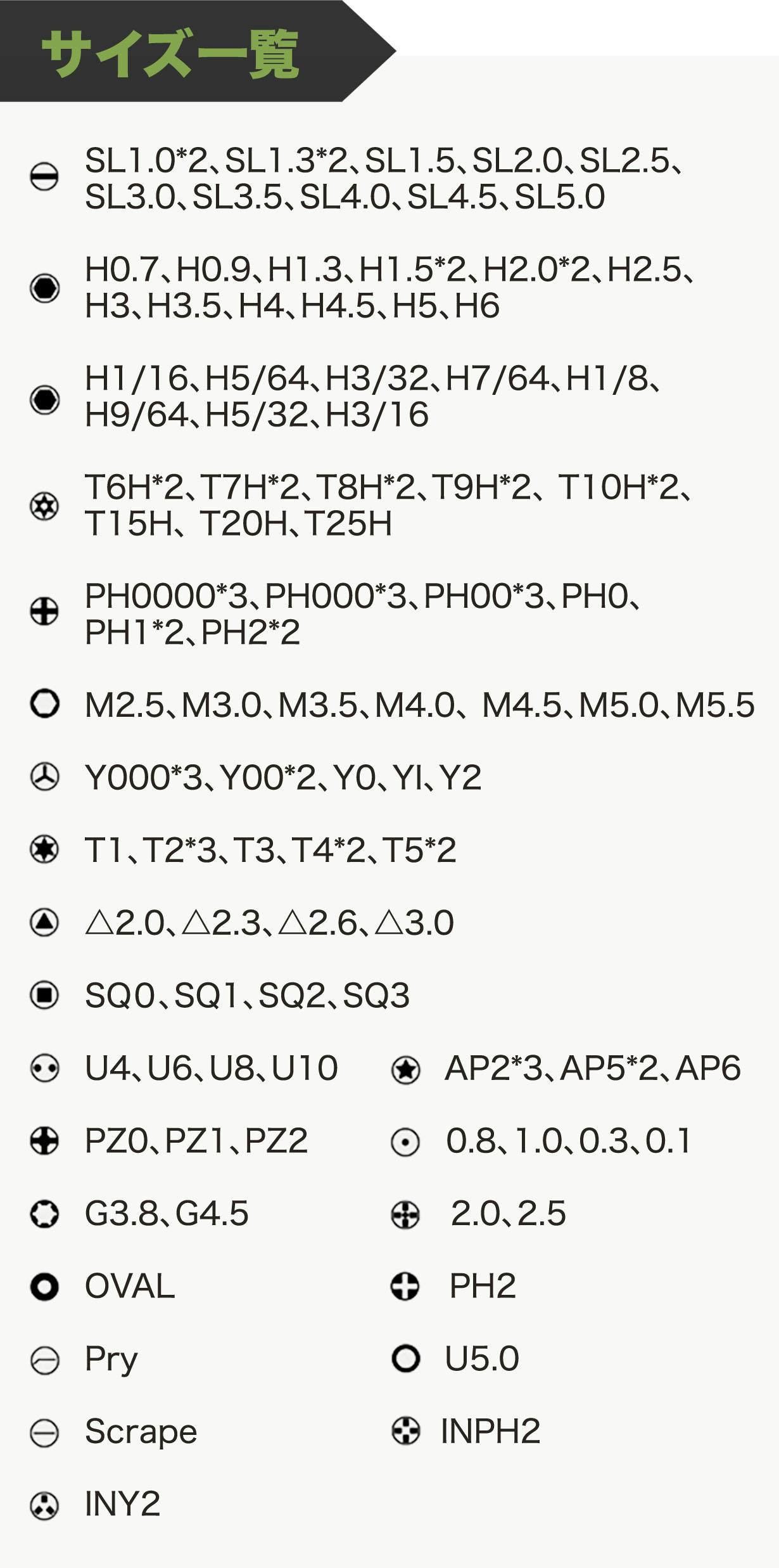 A:本製品には120個のビットが付属しています。収納用の差し込み穴の下にサイズと形状が印刷されているので、直感的に収納できます。