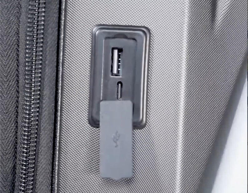 CYBER PACKの内部には、USB-AタイプとCタイプの端子を備えたケーブルが付いています。そこにお手持ちのモバイルバッテリーをつないでおけば外側の充電ポートから充電が可能。充電ポートは樹脂製のカバーでしっかり守られています。