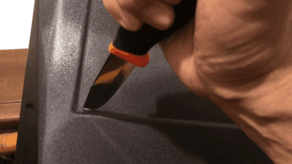 外装に使われているポリカーボネート樹脂の特徴は、とにかく頑丈なこと。こんなナイフくらいなら、ビクともしません。