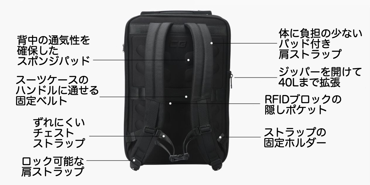 旅行や出張などではキャリーケースを持っていくことも多いでしょう。CYBER PACKの背中部分には、キャリーケースのハンドルに通せるストラップを装備。空港で長い距離を歩くときなど、ラクになりますよ。