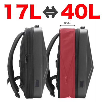 通常の荷室容積は17リットルで、書類やノートPCを運んだりするのにはじゅうぶん。そして出張で着替えやお土産を入れて中身が増えたときは、ファスナーをぐるりと開けばなんと2.4倍の40リットルに拡張! 前のモデルは奥行きが5cmの拡張でしたが、新モデルでは10cmに広がりました。頼もしいです!