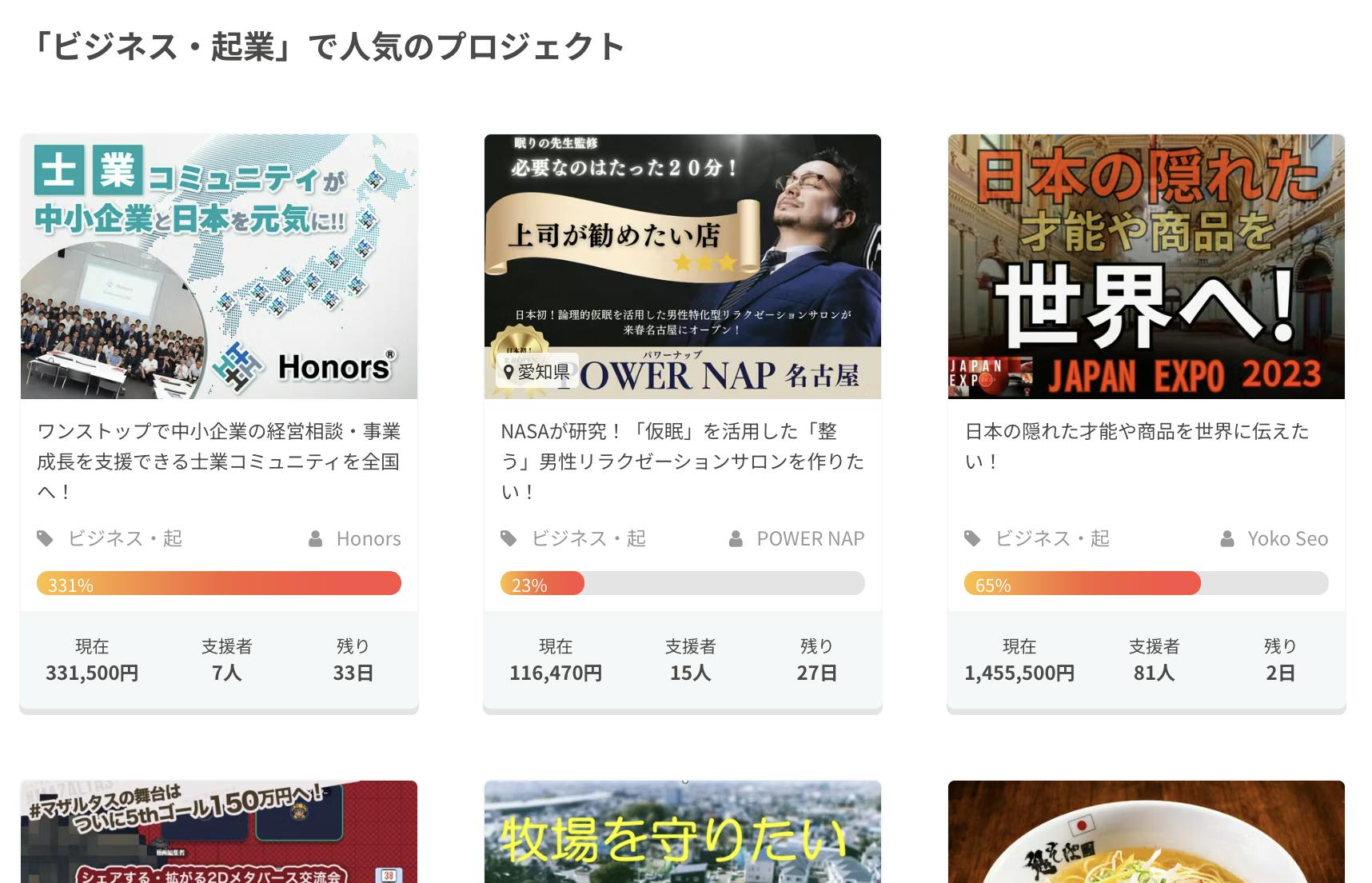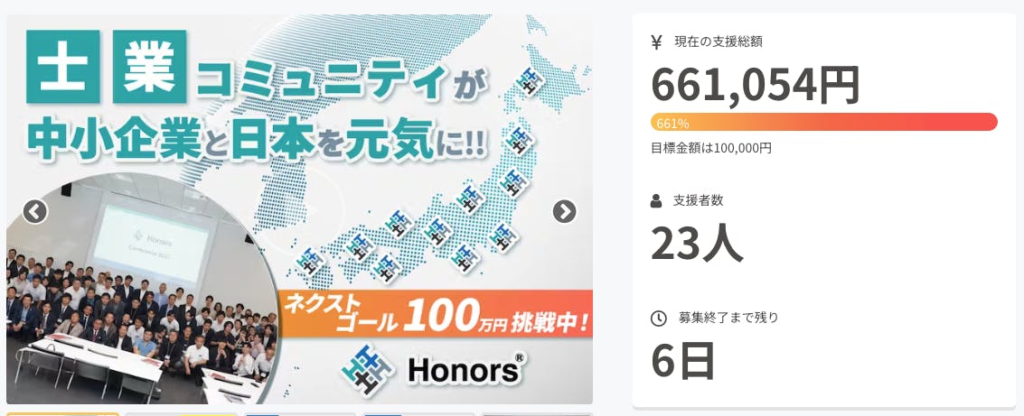 2023/11/28 10:05ありがとうございます!皆様のご支援のおかげで開始わずか3日で目標額達成しました‼︎しかもクラファン経由でご入会いただいた方がなんと3名も!このような形で新たなメンバーを迎え入れることができて嬉しいです。一緒に中小企業経営者、士業それぞれの悩みを解消し、日本経済を元気にしていましょう!さらに「ビジネス・起業」カテゴリで人気ランキング1位に!!!皆様のおかげです。本当にありがとうございます!Honors認知拡大のために引き続き拡散のご協力お願いいたします。ネクストゴールは50万円です!認知拡大のために多数の支援者を必要としています。少額でもご支援いただくと嬉しいですし、情報拡散いただくだけでも本当にありがたいです。まだまだ募集期間は続きます。最後まで応援よろしくお願いいたします!引き続き会員も募集しております!ご興味ある方はぜひ説明会へご参加ください。---------------------------------------------会員募集オンライン説明会の開催日時11月28日(火)12時〜12月5日(火)18時〜12月15日(金)12時〜12月25日(月)12時〜---------------------------------------------お申込は下記URLの問い合わせフォームよりお願いいたしますhttps://honors.jp/ もっと見る