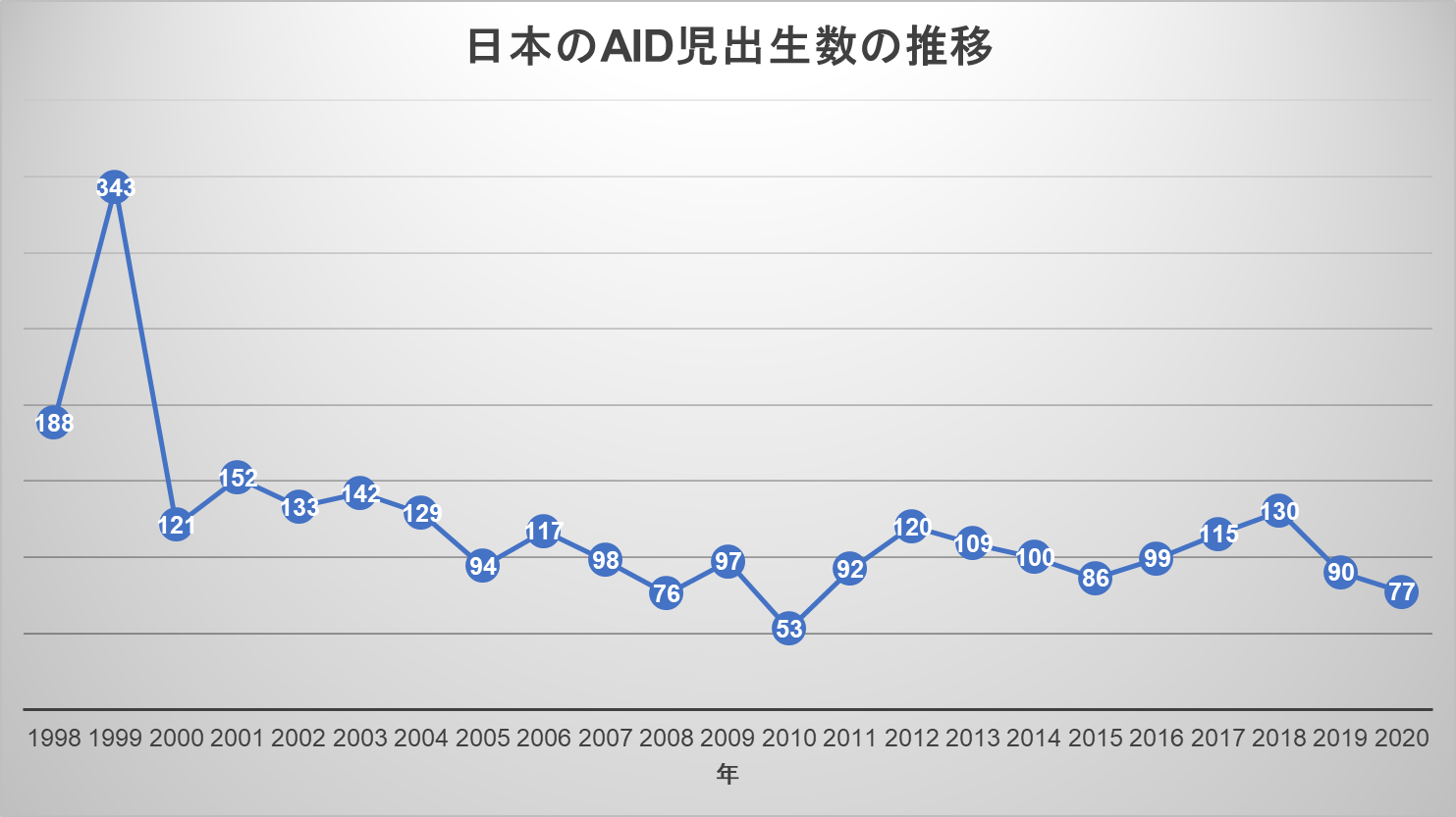 日本では1949年に国内初のAID児が誕生しました。それ以降もAID児は誕生してきましたが、その実数は把握されていません。ただ、1998年より日本産科婦人科学会が、学会に登録している医療施設について統計を取るようになりました。それが下に示す数字です。今でも1年に100人前後のAID児が誕生しています。