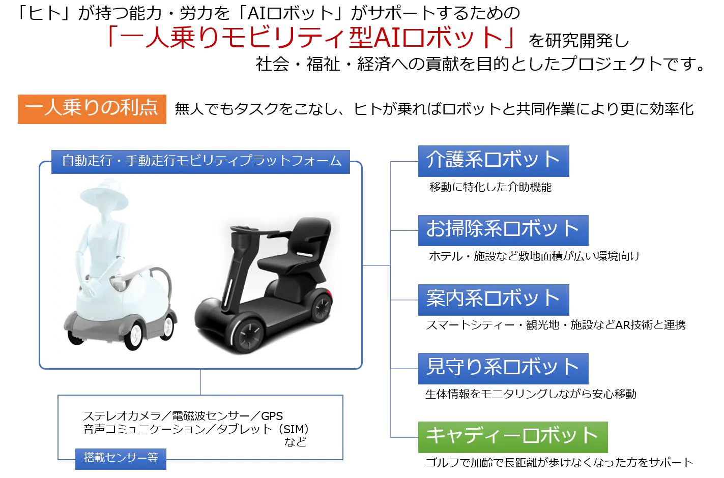 「一人乗りモビリティAIロボット」+「ゴルフ場」=「キャディロボット」