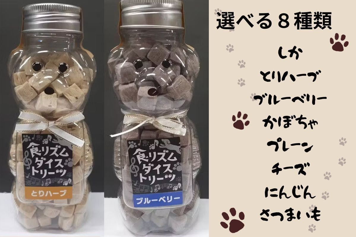 「食リズム」ダイストリーツの味は全部で8種類。「しか」「とりハーブ」「ブルーベリー」「かぼちゃ」「プレーン」「チーズ」「にんじん」「さつまいも」。中でもイチオシは「とりハーブ」です♪ ストレス軽減効果のあるハーブを使用し 本当の「おやつタイム」を提供します。