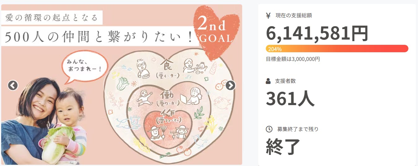 2023/12/20 10:30こんにちは!チームaiyueyoクラファン運営チームです。11月23日より始まったチームaiyueyoのクラウドファンディングは、12月17日に募集終了しました。おかげさまで、96名もの方々に応援いただきました。本当にありがとうございます。目標金額に対する達成率は47%という結果でしたが、多くのみなさまとごきげん仕込みの仲間になれたことを嬉しく思っています!■支援者数:96名■支援総額:1,421,000円(達成率47%)チームaiyueyoのメンバーが100人を超え、2024年はさらにaiyueyoのお隣のお隣へごきげんの輪を広げたい!という思いから始まった今回のプロジェクト。この機会に初めて愛食体験をしてみよう!と選び取ってくださった方や、来年の自分のためにごきげんな予定を一緒に仕込んでくださったみなさま。たくさんの温かい応援メッセージや拡散のご協力をいただき大変励みになりました。食からごきげんをつくろうという輪を少しでも、一人でも多く広げられたことがとても嬉しく、感謝の気持ちでいっぱいです。思い思いに大切に選び取っていただいた愛食体験をみなさまへお届けする準備をしていますので、楽しみにお待ちくださいね。また、全てのリターンに招待券をつけていた愛食フェスの日程が変更となりましたので、ご連絡させてください。■変更前:2024年4月21日(土)■変更後:2024年5月25日(土)なお、会場は下北沢のBONUS TRACKに決定しました!現段階で確定している情報につきましては下記をご覧ください!【イベント概要】イベント名称:愛食フェス開催日:2024年5月25日(土)開催場所:BONUS TRACK 東京都世田谷区代田2丁目36番12号〜15号今回ご協力くださったみなさまへの感謝の気持ちを込めて、愛食を起点にしたごきげんをじっくり体験できるような企画を進めています。どうか楽しみにお待ちいただけると嬉しいです!みなさまと直接お会いできますように!支援者の方々には、今後、リターン準備の様子や愛食フェスの続報など、近日中に活動報告やメールにてご案内いたします。何かご不明点等がございましたら事務局までご連絡ください。(チームaiyueyoクラファン運営チームアドレス:aiyueyo.crowdfunding@gmail.com)ごきげん元年を一緒に楽しみましょう!チームaiyueyoメンバー一同 もっと見る