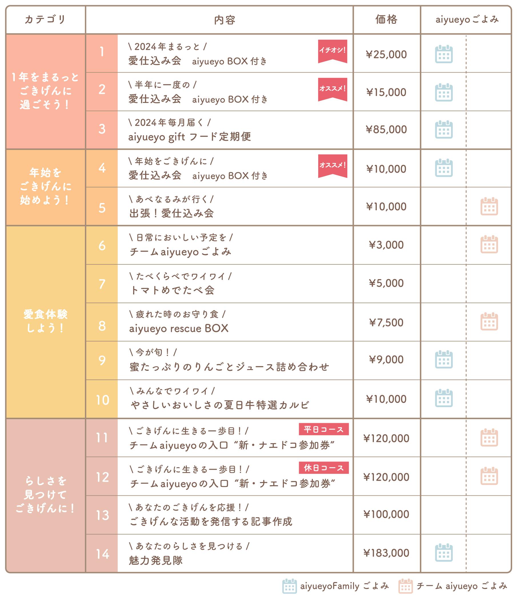 その他、今回のプロジェクトではチームaiyueyoが結集し、たくさんのリターン品をご用意しました!2024年を自分らしくごきげんに過ごすため、さまざまなリターンがあなたを応援します。