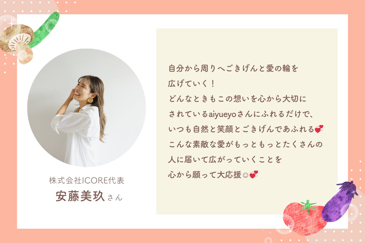 そのために、まずは愛食を通して自分を満たす感覚を知ってほしい!ごきげんな人を増やしたい!自分を満たして自分らしさを発揮して生きられる世界があることを知ってほしい!心からそう思っています。