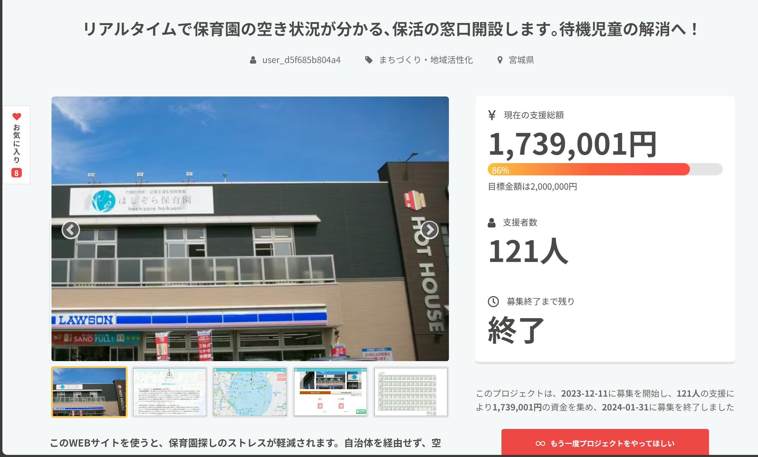 2024/02/01 11:00ご支援いただきありがとうございました。この度は、ほしぞら保育園仙台六丁の目を運営する、株式会社天体の【保活の窓口】開設にあたりご支援、ご協力をいただきありがとうございました。121人、1,739,001円のご支援をいただきました。保護者様の目線にたった、リアルタイムで保育園の空き状況等を確認する仕組みは2018年4月の開園と同時に考えていましたが、企業主導型保育園という制度が始まったばかりで、認可外保育施設であることからも、認知度が低いため、リリースするタイミングを今日まで待っていました。認可外保育施設とはいえ、同じく運営する系列の小規模認可、きらり保育園と同様に、100%保育士での配置基準や、看護師が常駐しつつ、保育補助もいるという手厚さで、おむつや布団もご自身で用意することはなく、料金が20,000円という設定で運営してきたことから、充足率は6年を通して99%という結果を残すことができました。最大の売りは空きさえあれば、直接申込ができる。という点です。これから、宮城県内の企業主導型保育園に【保活の窓口】への掲載と更新のご依頼をし、ご賛同いただける皆様と理想の子育て環境を作る一助になると共に、行政へも引き続きの協働を働きかけます。こちらのURLからシステムの登録が可能です。ご利用の対象者が周りにいらっしゃいましたら、お声がけいただきますよう重ねてお願い申し上げます。https://hoshizorahoiku.com/株式会社天体代表取締役 木村由希 もっと見る