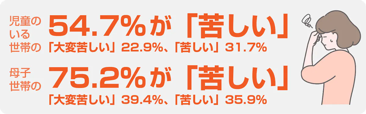 生活意識の状況 として、「苦しい」の割合は、「児童のいる世帯」では 54.7%(大変苦しいが22.9%、苦しいが31.7%)に、「母子世帯」では 75.2%(大変苦しいが39.2%、苦しいが35.9%)にもなっています。(※厚生労働省発表、2022年国民生活基礎調査より)