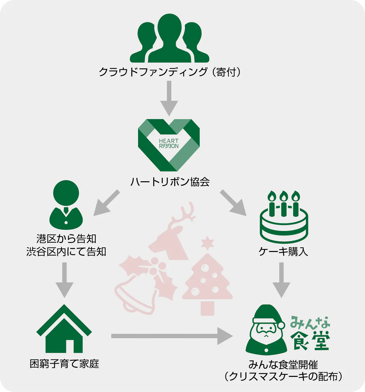 2024/01/06 21:43多くの皆さんのご支援をいただき、子どもたちにクリスマスケーキを無事に届けることができました。本当にありがとうございました。心より感謝申し上げます。物価高騰の中、大変な思いをしている子育て家庭はまだまだあります。私たちでできることは限られており、手の届く範囲で、できることとなりますが、少しでも多くの子どもたちが、クリスマスケーキによって楽しい時間を笑顔で過ごしてもらえたら嬉しいです。この度はご支援いただきまして誠にありがとうございました。あらためてご寄付いただきました全ての皆様に心よりお礼申し上げます。本当にありがとうございました。<クリスマスケーキをご寄付いただいた方々>クラウドファンディングにて、3万円以上(クリスマスケーキ10個分以上)ご寄付いただいた方々をご紹介いたします。多額なご寄付をいただき誠にありがとうございました。◇ 萩原国博 様◇ ステラ・コーポレート株式会社 様◇ METイノベーション国際推進機構 様◇ 株式会社サンカラーシッピング 代表 河原玲青 様◇ 東京キングライオンズクラブ 様◇ ユーエスエヌ株式会社 様◇ 一般社団法人全国経営者団体連合 様◇ 株式会社バリューアップデザイン 様◇ DSHアカデミー 様◇ 芸術福祉振興機構グレイス・ソサエティ 様◇ 医療法人社団フェイス会 理事長 柴山拓郎 様◇ 株式会社富士誇 代表 可野大誉 様◇ ハーバーベスト・パートナーズ・ジャパン株式会社 様◇ 古川竜也 様◇ 小田切光 様◇ 熊谷晶紀 様◇ 牛田喜博 様◇ 株式会社エアーズ 様◇ 鵯宙二郎 様◇ 岡澤晃良・亜希 様◇ 荒井琢麿 様◇ 吉岡孝浩 様◇ 山本貴之 様▼以下に、ハートリボン協会に届いている声の一部をご紹介いたします▼「とても素敵なケーキで、本当にクリスマスが特別なものにできました。ありがとうございました」「本当に嬉しかったです、美味しく頂きました。子供も大喜びでした。ありがとうございました」「ひとり親になって初めてホールケーキを囲めたので子どもたちがとても喜んでいました。素敵なクリスマスになりました。ありがとうございました」「物価高騰によりクリスマスケーキも大変高価でうちでは買えなかったので本当にありがたかったです」「このたびは素晴らしいクリスマスケーキの配布のイベントをありがとうございました。3人のスペシャルサンタさんにもとてもよくしていただき、とても嬉しかったです。いただいたケーキは子どもたちと美味しくいただき、とても良いクリスマスになりました。ありがとうございました」プロジェクトリターンの、クリスマスケーキ配布のレポート、スペシャルサンタ(石田純一さん、セイン・カミューさん、池谷幸雄さん)からの動画メッセージは、現在準備しております。1月中旬にお届けできる予定です。 もっと見る