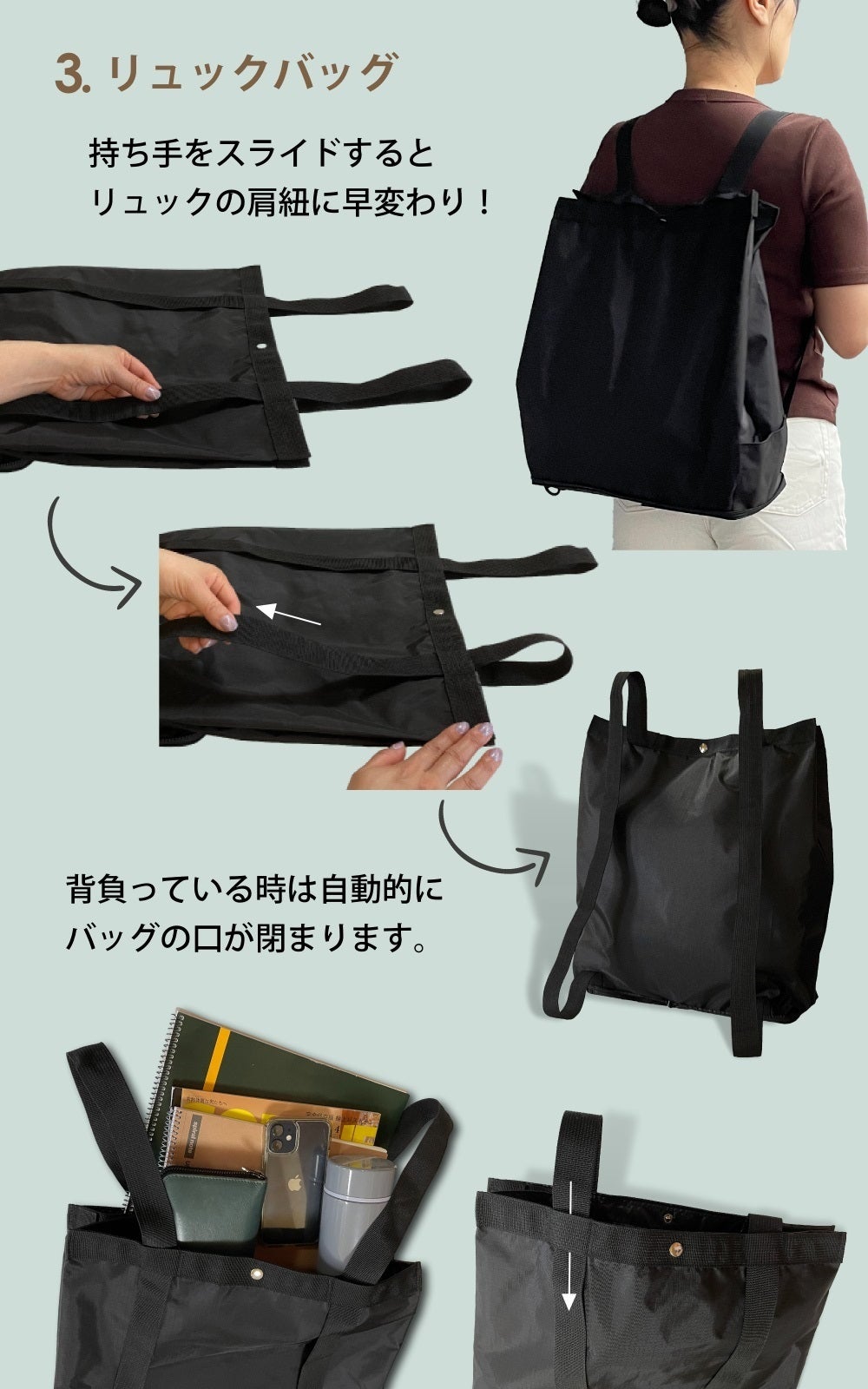 そんな悩みを解決するために「手提げ」「肩掛けショルダー」「リュック」を用途に合わせ、瞬時にアレンジできる3Wayモデルとしてデザインしました。