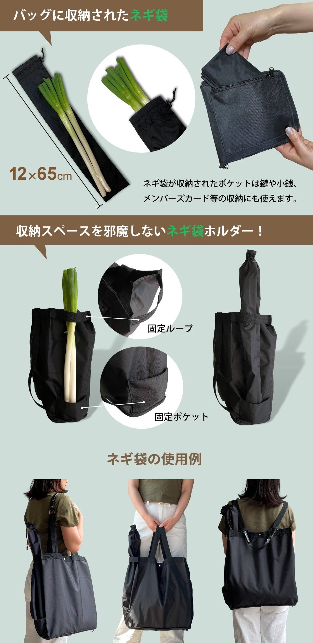 スーパーでのお買い物でいつもバッグからはみ出すネギ。汚れやニオイはもちろん、見た目も気にされる方も多いと思います。そんな悩みを解決するために「ネギ袋」をセットしました!
