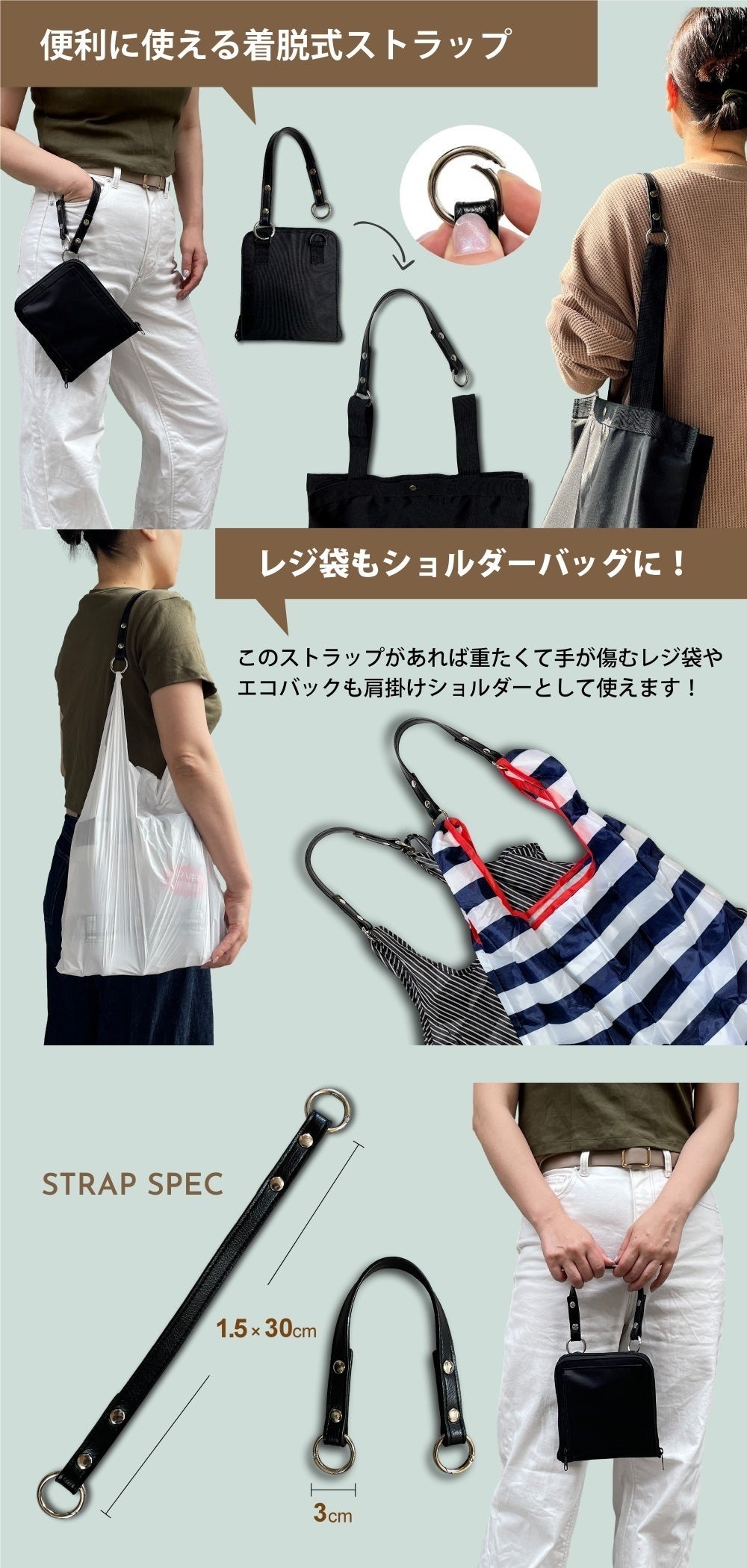 さらにこのストラップがあれば、レジ袋やお手持ちのエコバックをショルダーバッグにアレンジでき、単体でも幅広く活用いただけるとても便利なアイテムです!