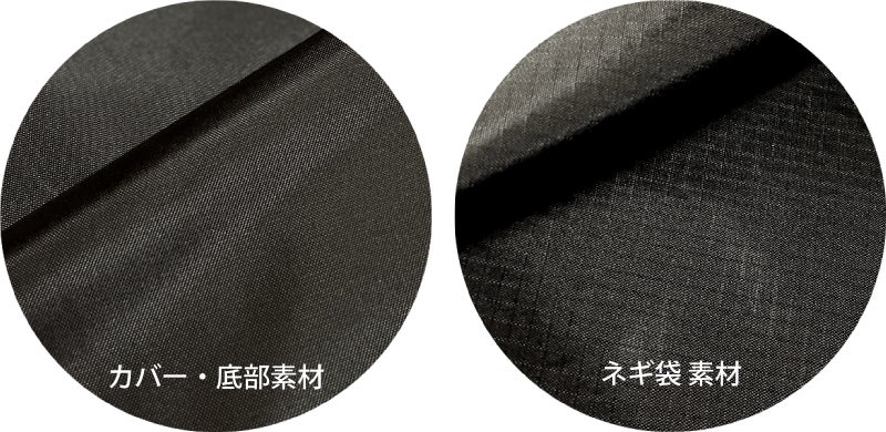 ネギ袋に使用したリップストップ素材は、メイン素材に比べ収納しやすい、一般的なエコバッグに使用される薄手の素材を採用しました。匂いが付着しやすいネギ袋は、しっかり水洗(手洗い)が可能です。