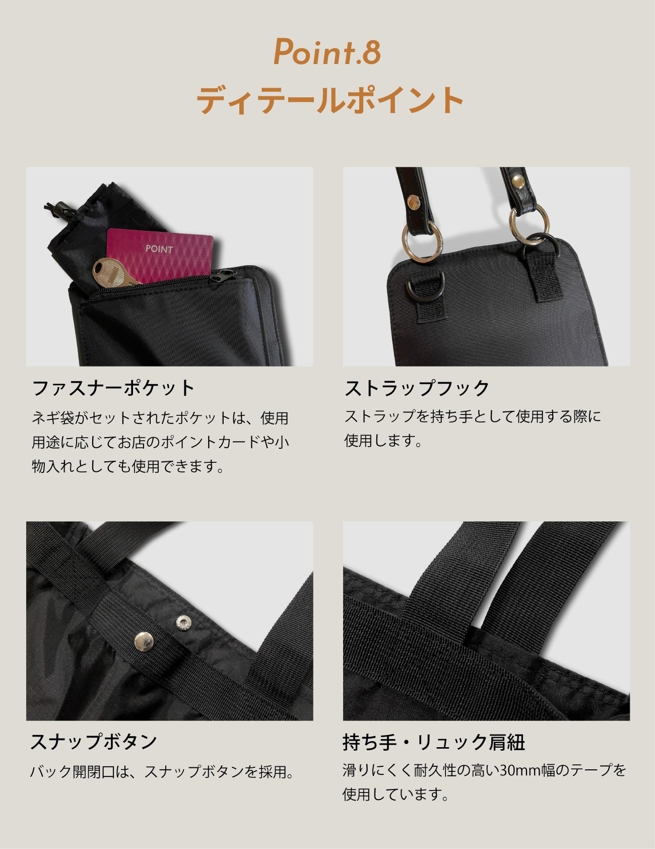 そんな悩みを解決するために、メインの収納スペースを邪魔しない ネギ袋ホルダーをバッグ側面に付けました!