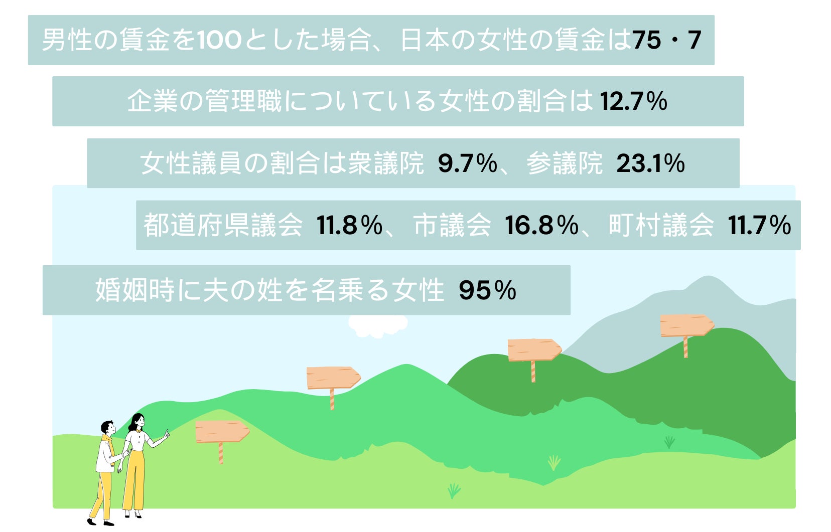 【参考資料】厚労省の2022年「賃金構造基本統計調査」/厚労省の2022年度「雇用均等基本調査」/女性議員の割合は総務省や内閣府男女共同参画局の調査(2021年現在、参議院のみ2022年現在)