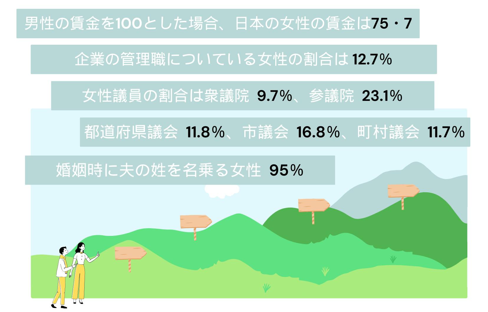 【参考資料】厚労省の2022年「賃金構造基本統計調査」/厚労省の2022年度「雇用均等基本調査」/女性議員の割合は総務省や内閣府男女共同参画局の調査(2021年現在、参議院のみ2022年現在)