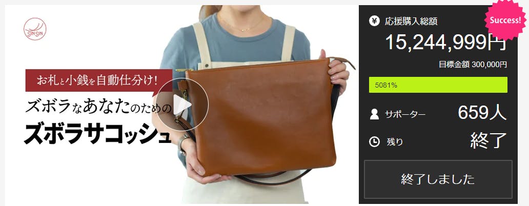 前回に行ったズボラサコッシュ-Large-は659人の支援者様から15,244,999円集まりました。