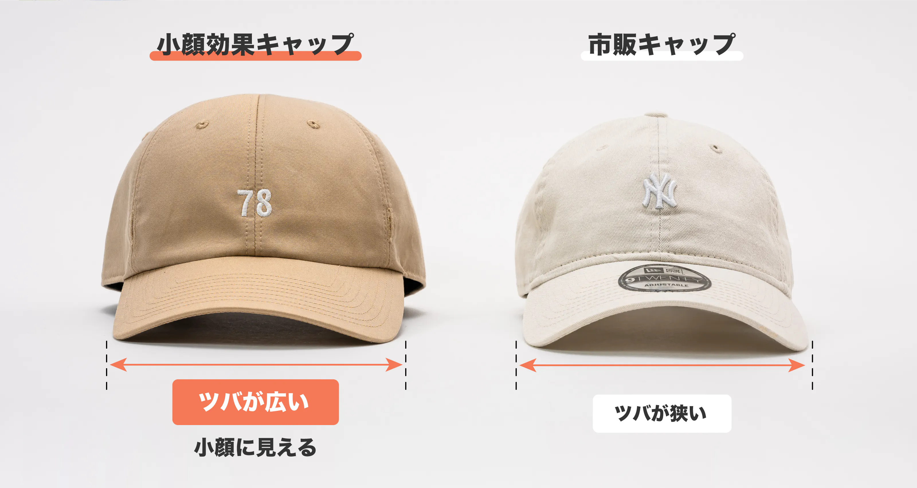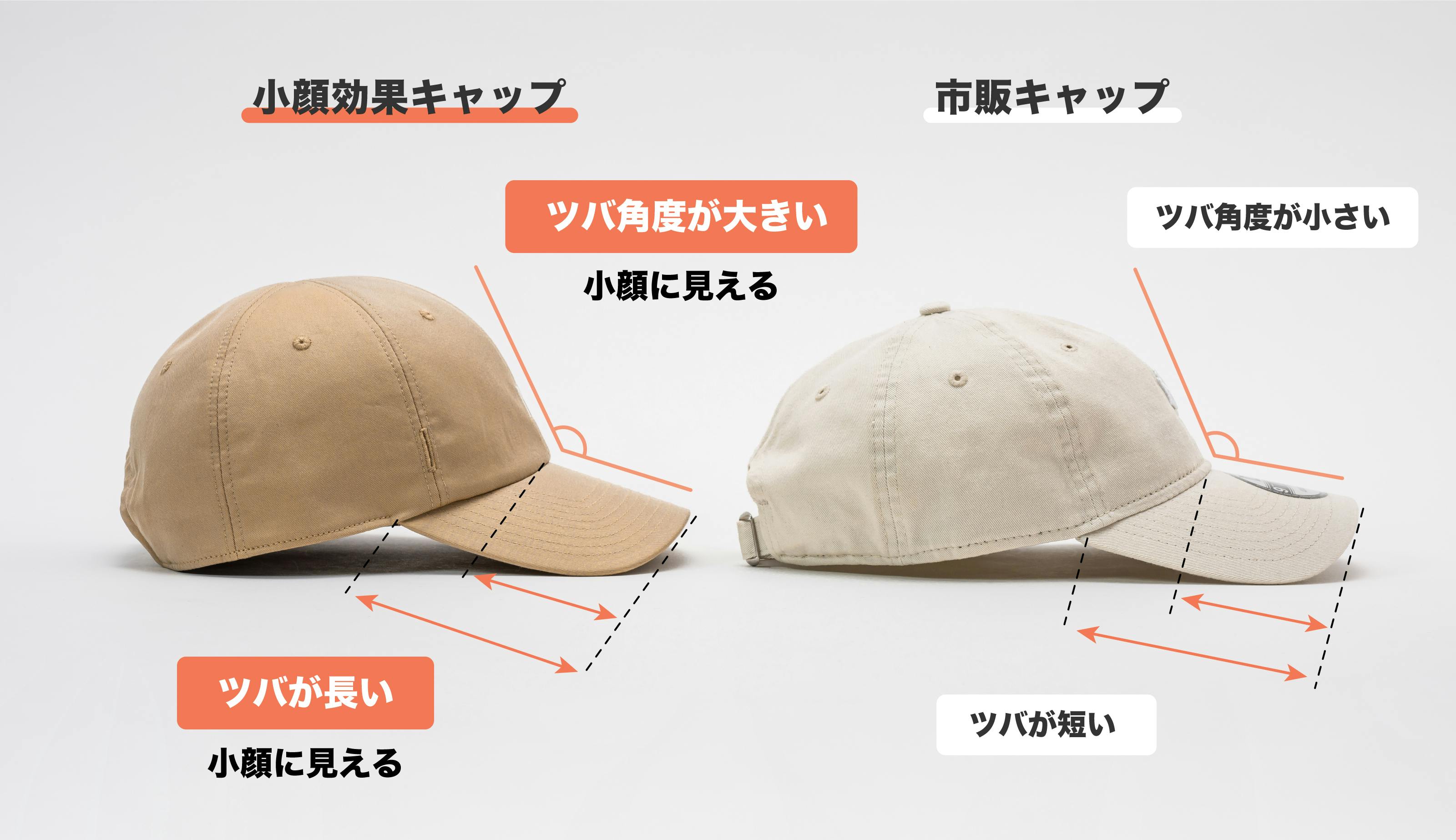 ファッションシーンで多くの女性が被っていると予想されるキャップと比較して、帽子工場さんと開発した【小顔効果】をご理解頂けると嬉しいです。