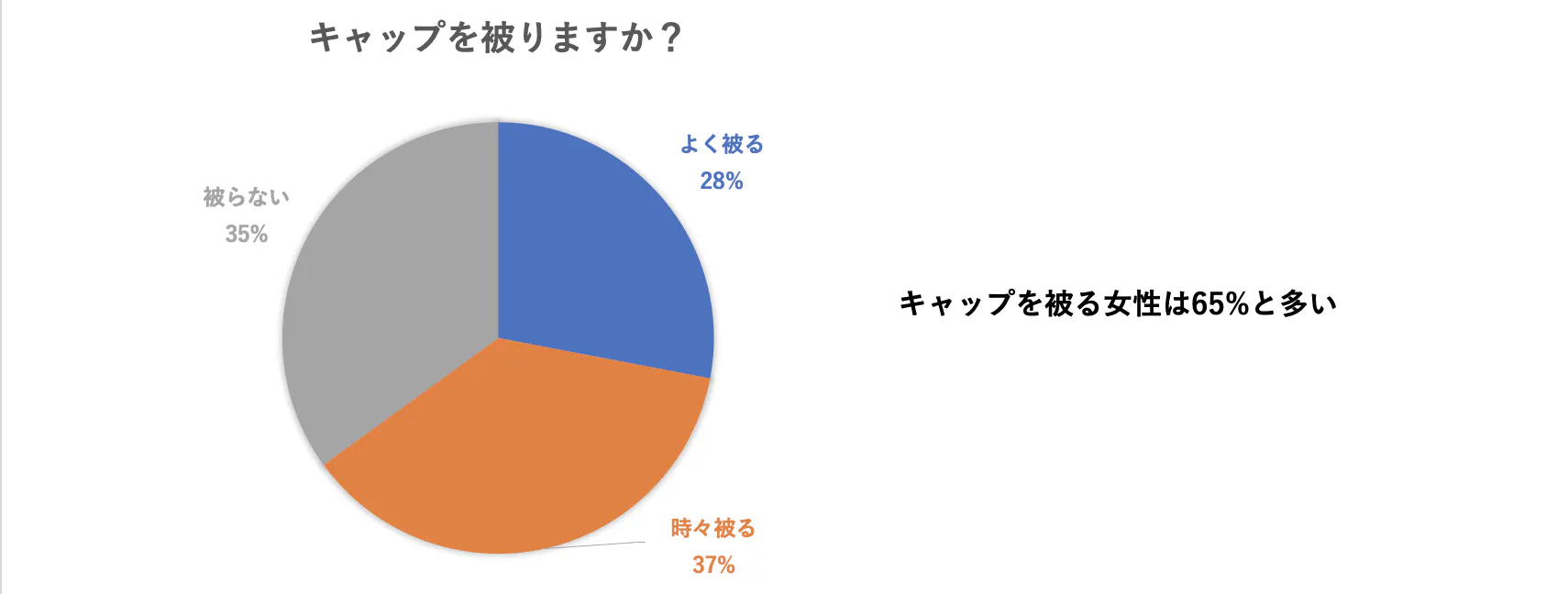 アンケートに回答頂きました女性(女性ライダーを多く含む)の皆様の65%はキャップを被っています。