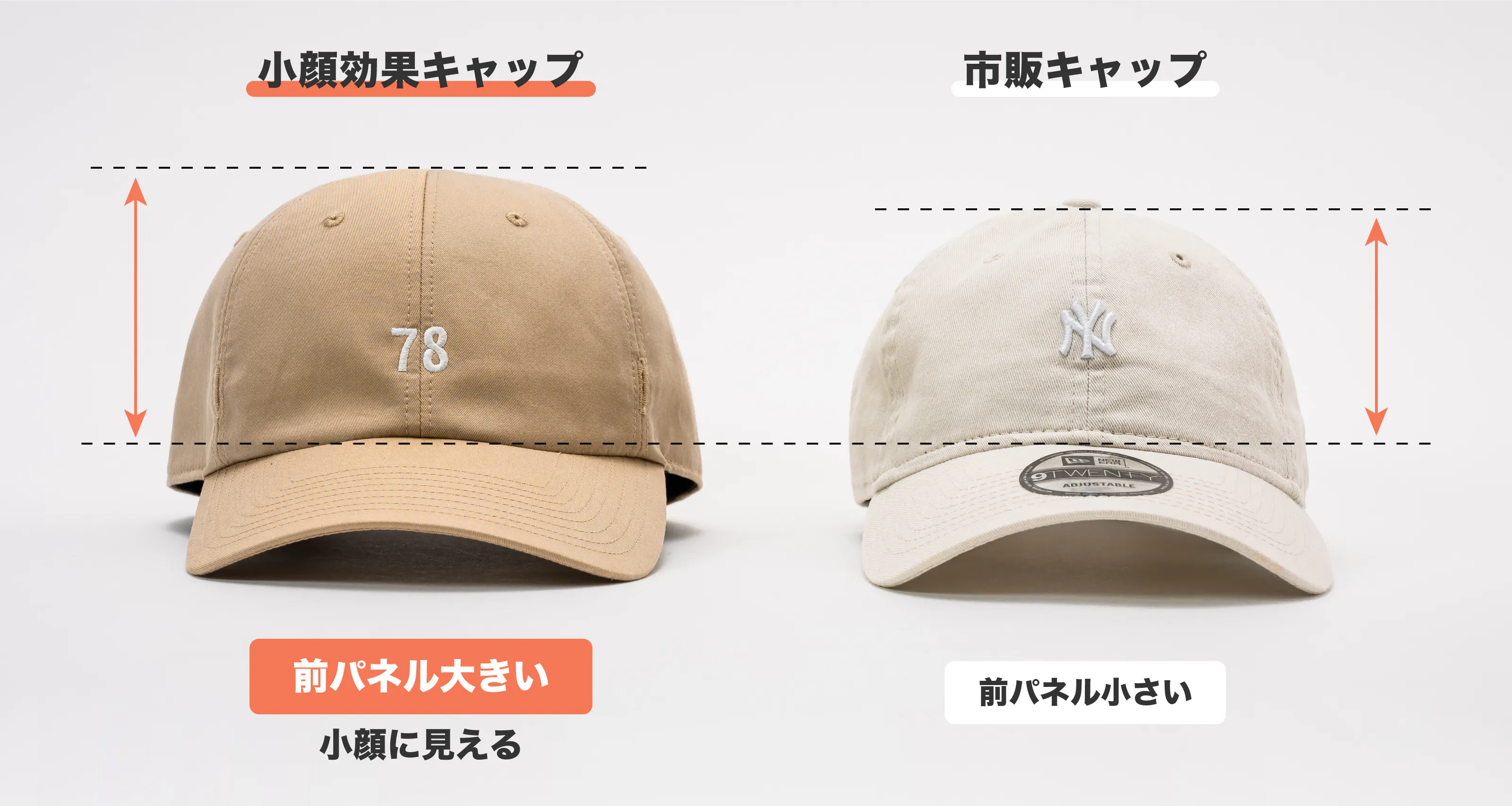 顔を小さく見せるには、帽子の面積を顔より大きくしないといけません。正面から見た時にキャップの前パネル部分が小さく見えると相対的に顔が大きく見えてしまいます。