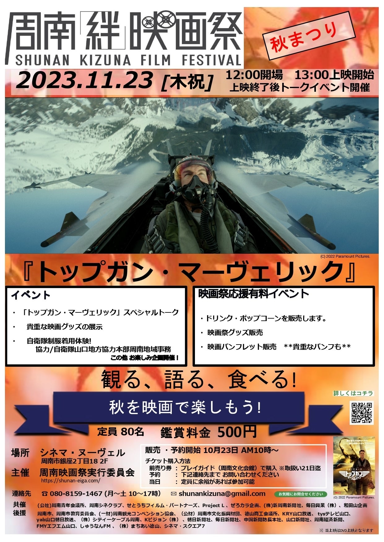 今回、その資金確保と、また新たな企画で映画を地域の皆様に楽しんでもらいたい、と周南「絆」映画祭のスピンオフイベントとして「秋まつり」を11 月23 日(木・祝)に開催し、「トップガン マーヴェリック」の上映や貴重な映画パンフレット販売など、様々な企画を考えています。