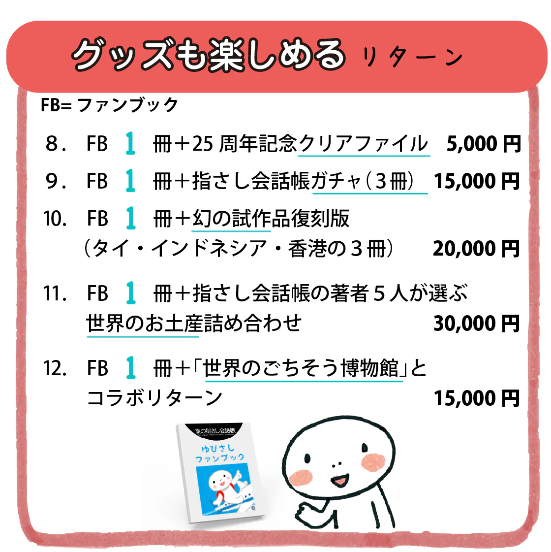 指さし会話帳を、創刊して間もない頃から知るコアな読者の方も、今回クラウドファンディングをきっかけに知ったという方も、海外旅行や文化は好きなはず。そこで20種以上のリターンをご用意、きっとあなたの好みに合うものが見つかるはずです。